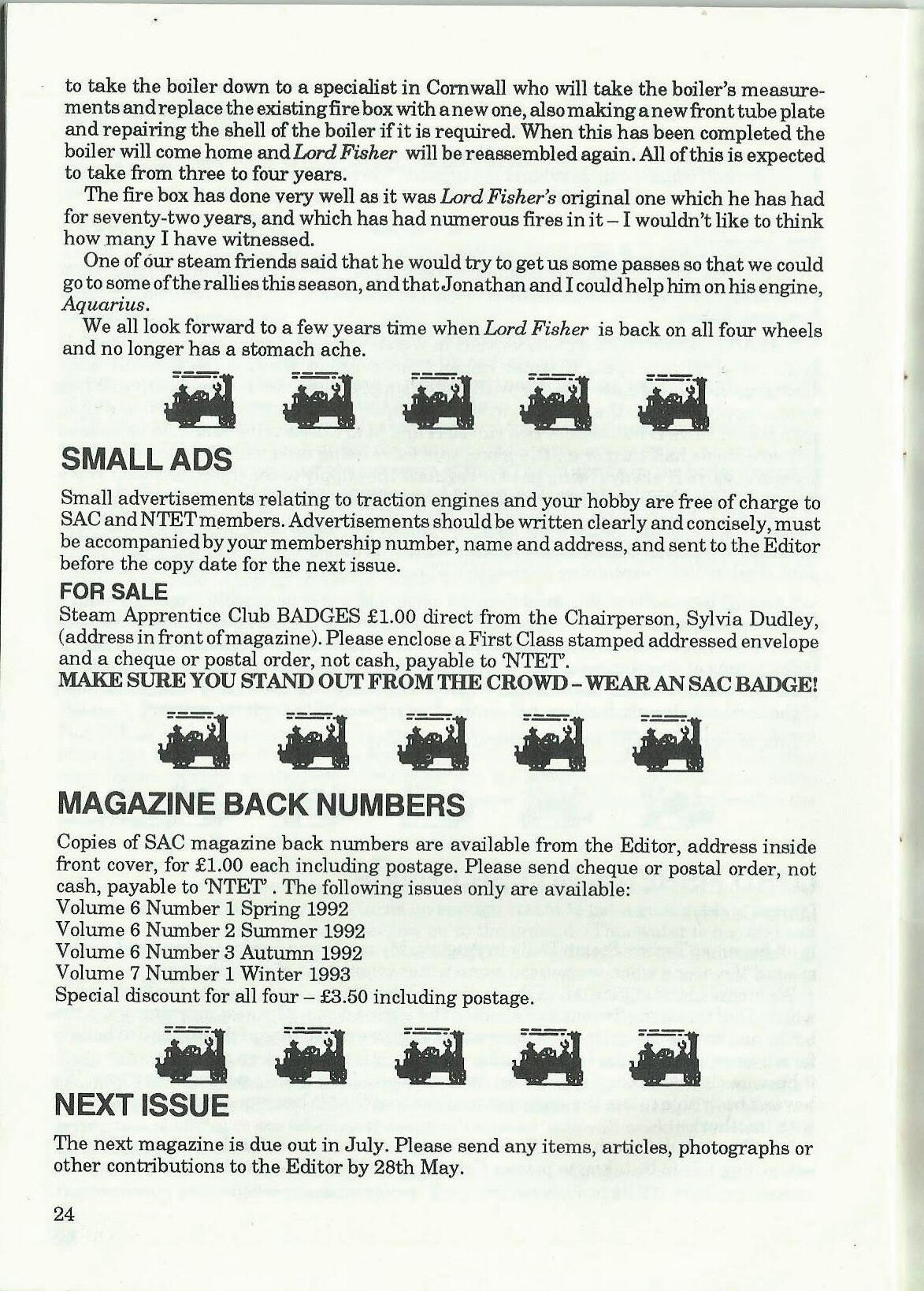 Small advertisements relating to traction engines and your hobby are free of charge to SAC and NTETmembers. Advertisements should be written clearly and concisely, must be accompanied by your membership number, name and address, and sent to the Editor before the copy date for the next issue.