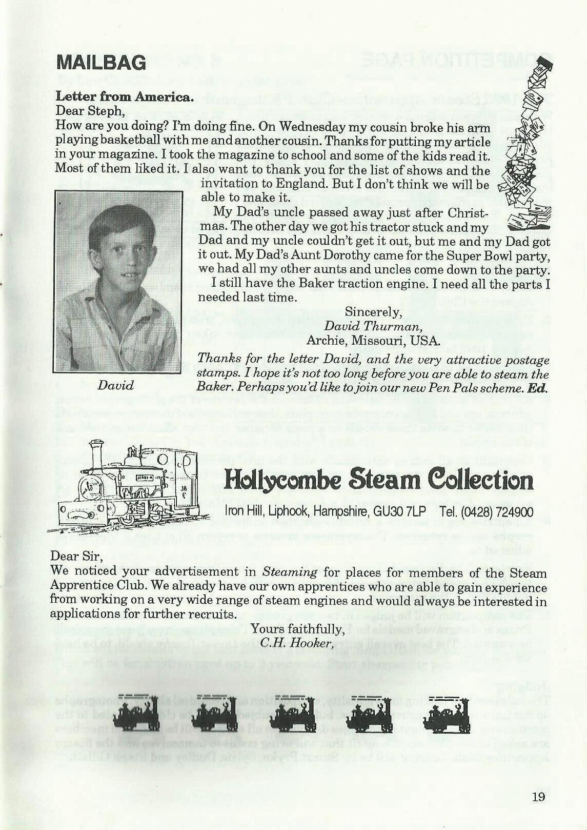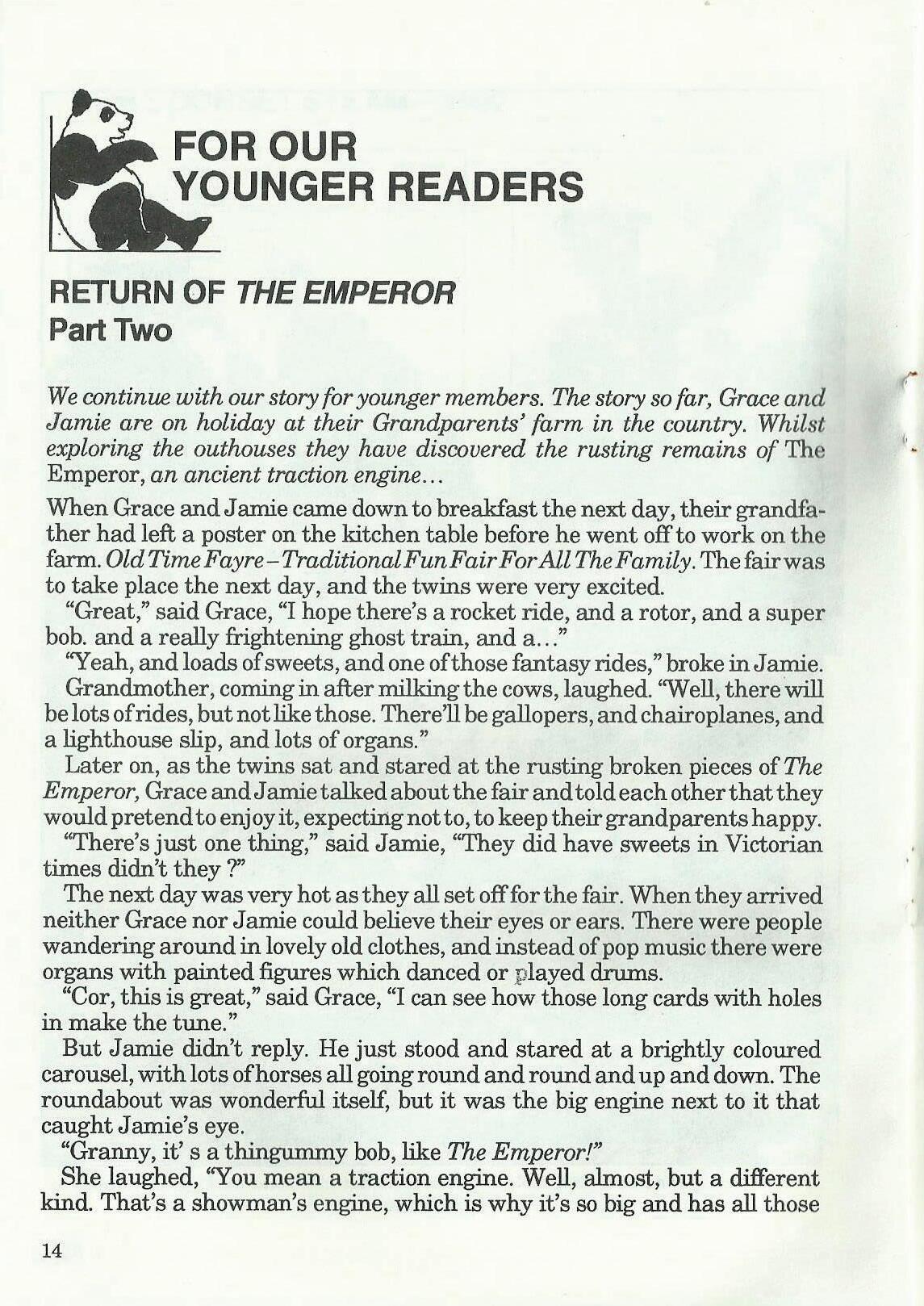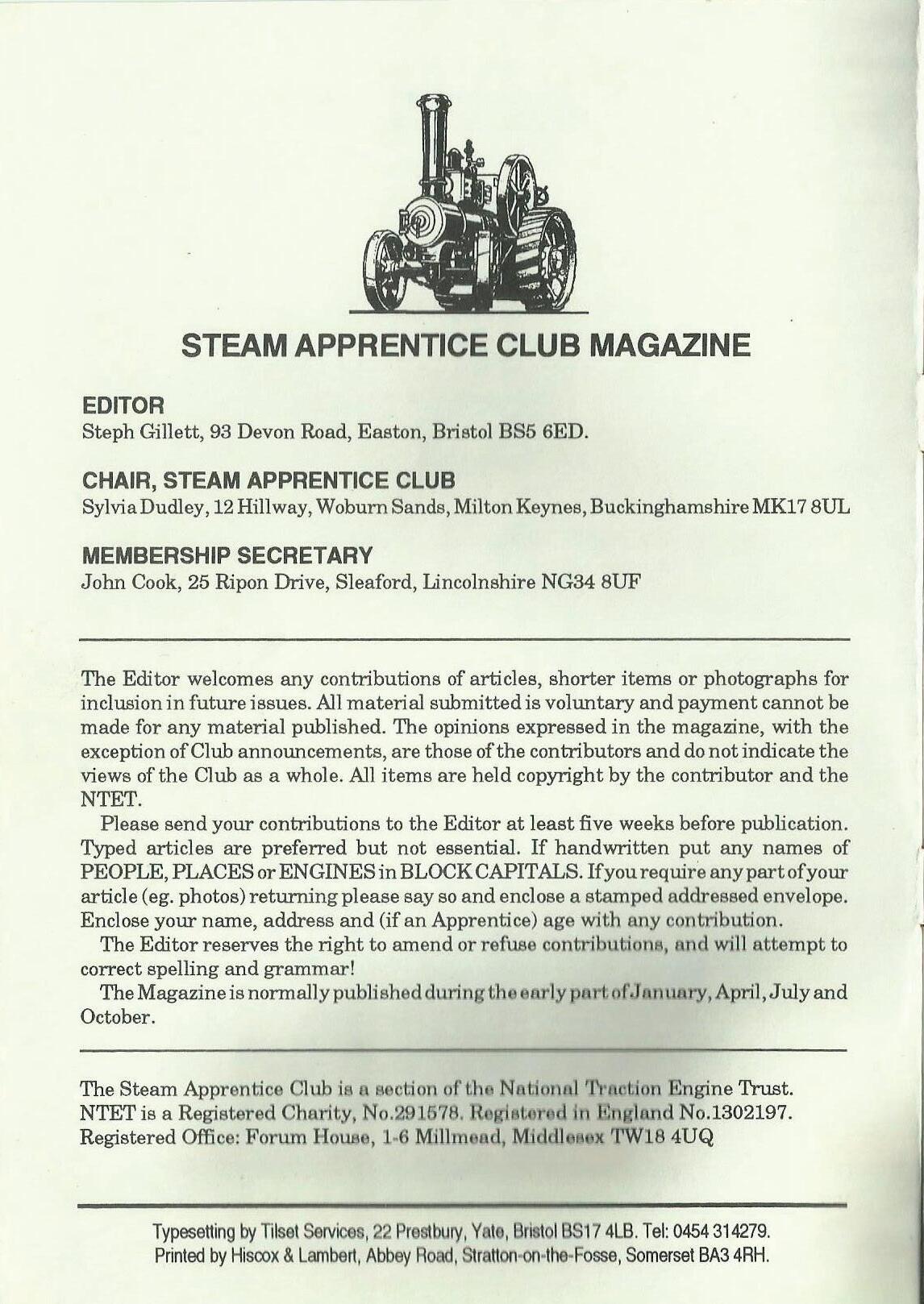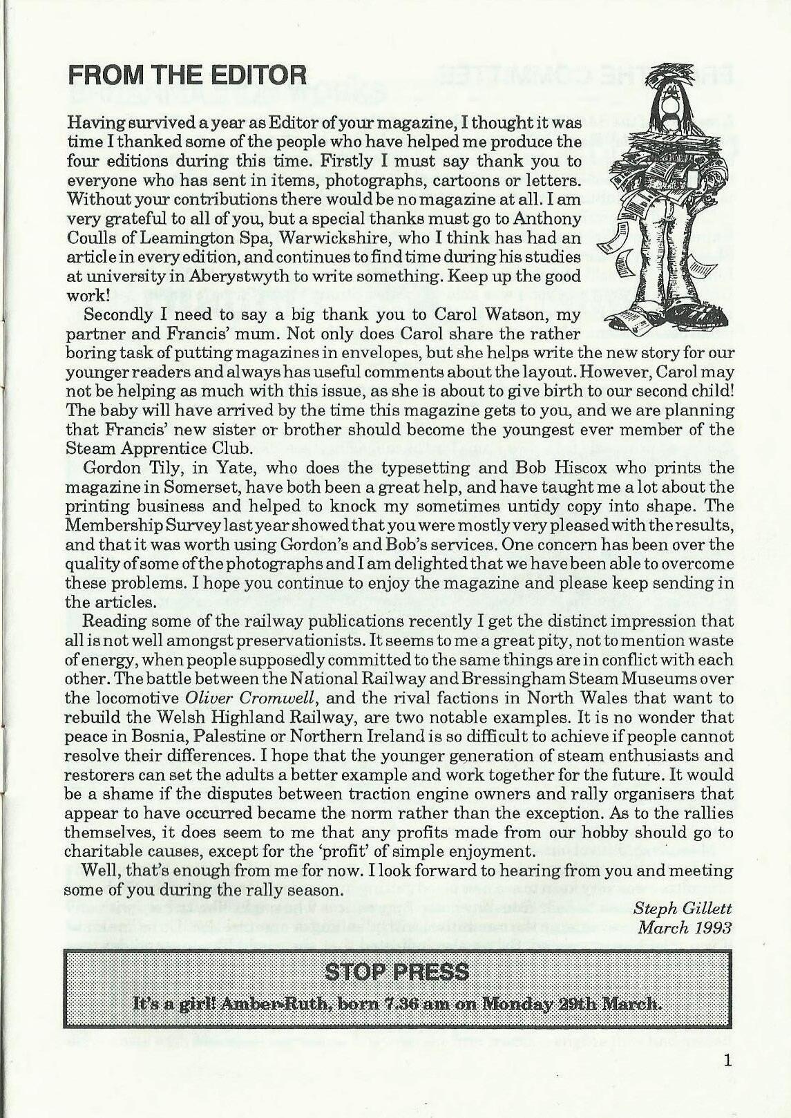 Secondly I need to say a big thank you to Carol Watson, my partner and Francis' mum. Not only does Carol share the rather boring task of putting magazines in envelopes, but she helps write the new story for our younger readers and al ways has useful comments about the layout. However, Carol may not be helping as much with this issue, as she is about to give birth to our second child! The baby will have arrived by the time this magazine gets to you, and we are planning that Francis' new sister or brother should become the youngest ever member of the Steam Apprentice Club.