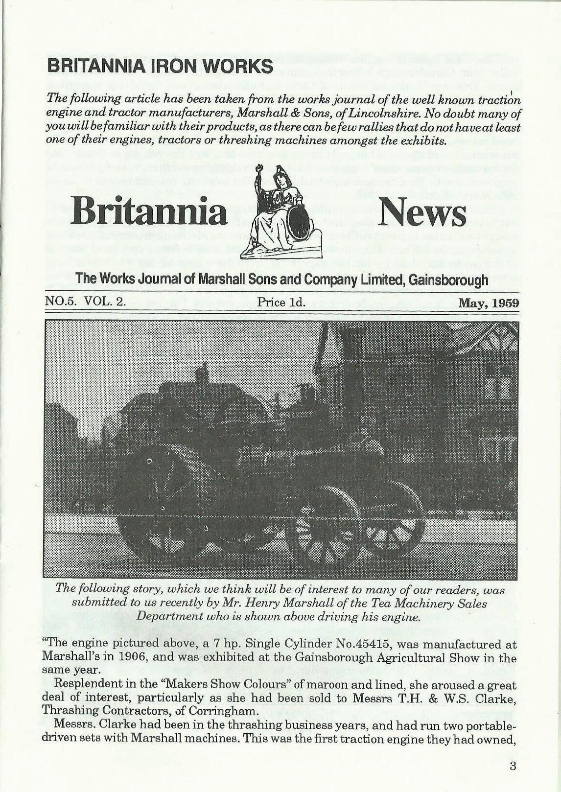The following artide has been taken from the works journal of the well known traction engine and tractor manufacturers, Marshall & Sons, of Lincolnshire. No doubt many of you will befamiliar with their products, as there can be few rallies that do not have at least one of their engines, tractors or threshing machines amongst the exhibits.