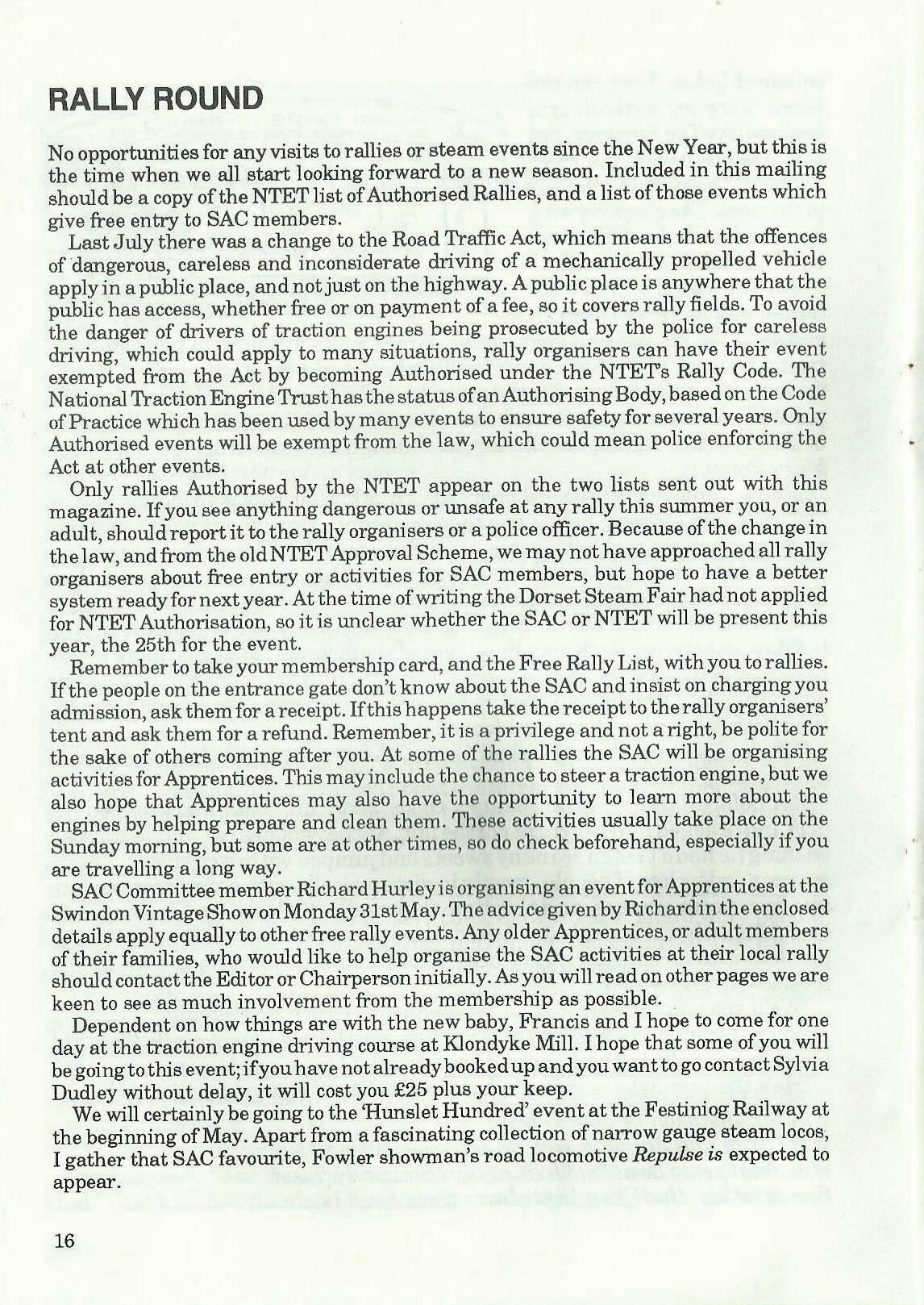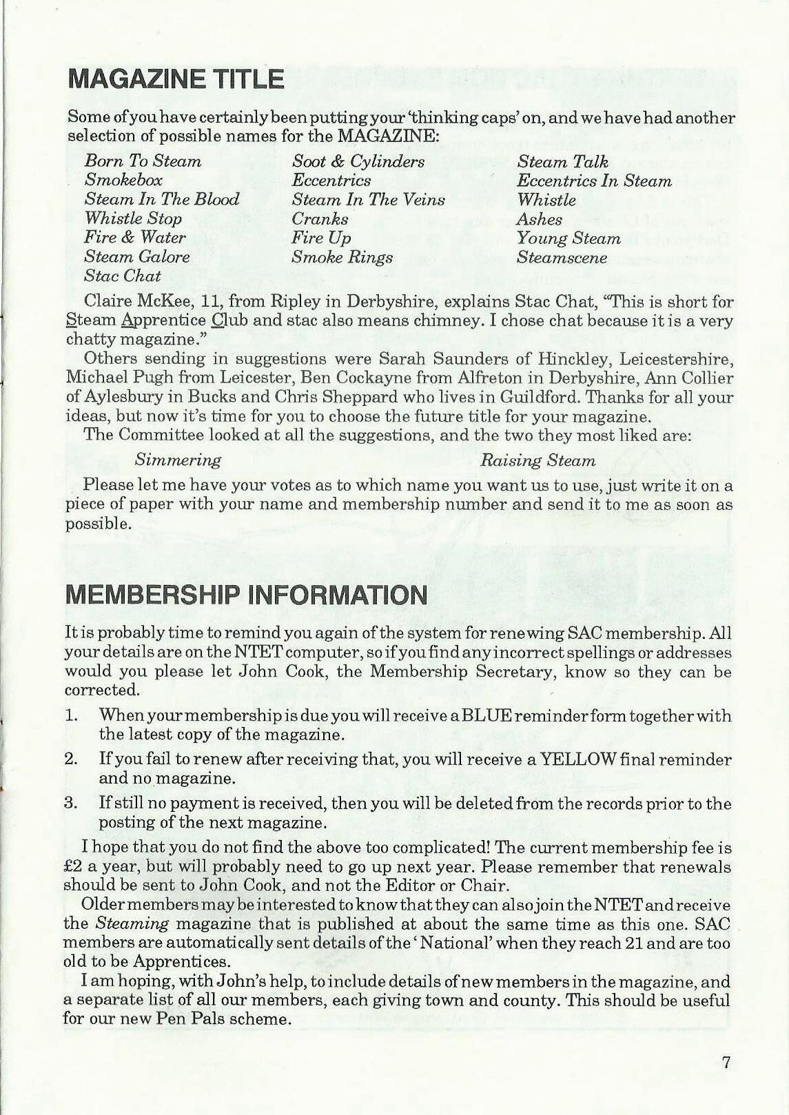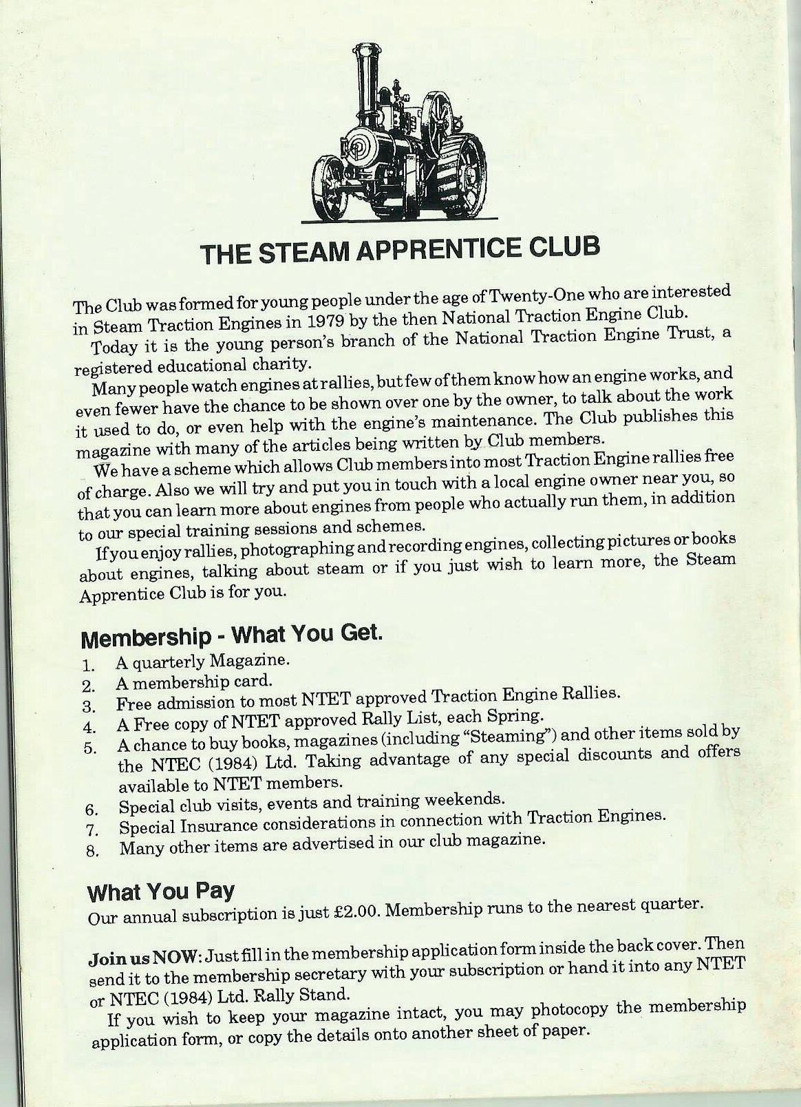 Older members maybe interested to know that they can also join theNTETandreceive the Steaming magazine that is published at about the same time as this one. SAC members are automatically sent details of the< National' when they reach 21 and are too old to be Apprentices.