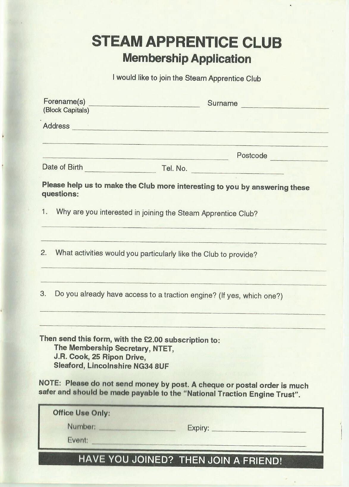 NOTE: Please do not send money by post. A cheque or postal order is much safer and should be made paynble to the "National Traction Engine Trust". Off ice U Only: