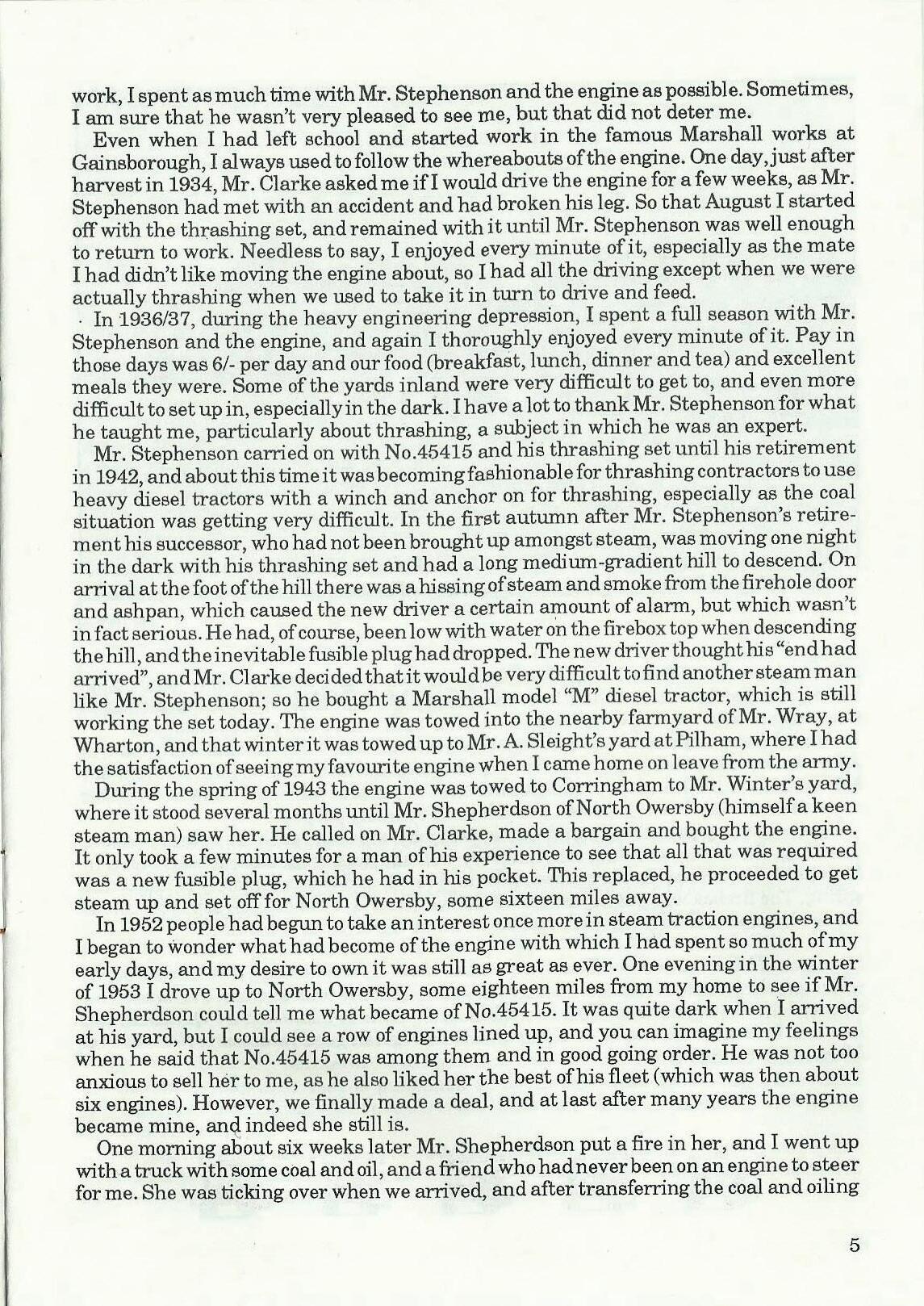 In 1952 people had begun to take an interest once more in steam traction engines, and I began to wonder what had become of the engine with which I had spent so much ofmy early days, and my desire to own it was still as great as ever. One evening in the winter of 1953 I drove up to North Owersby, some eighteen miles from my home to see if Mr. Shepherdson could tell me what became ofNo.45415. It was quite dark when t arrived at his yard, but I could see a row of engines lined up, and you can imagine my feelings when he said that No.45415 was among them and in good going order. He was not too anxious to sell her to me, as he also liked her the best of his fleet (which was then about six engines). However, we finally made a deal, and at last after many years the engine became mine, and indeed she still is.