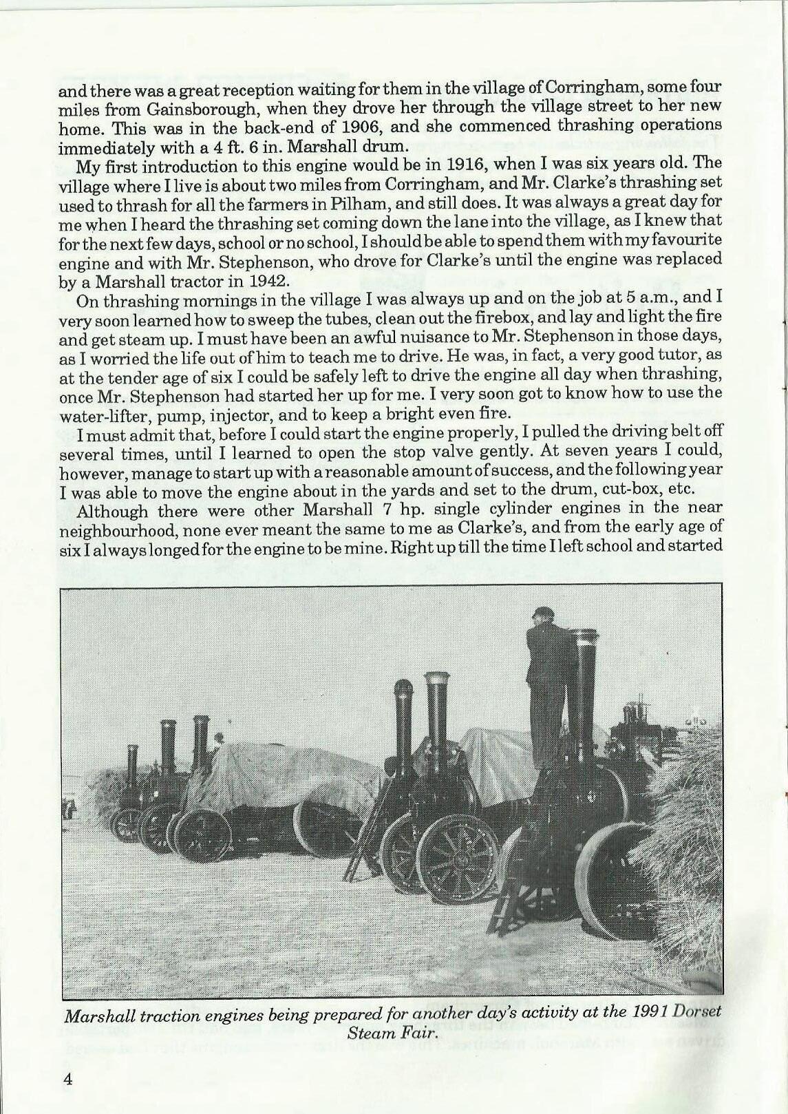 My first introduction to this engine would be in 1916, when I was six years old. The village where I live is about two miles from Corringham, and Mr. Clarke's thrashing set used to thrash for all the farmersinPilham, and still does. It was always a great day for me when I heard the thrashing set coming down the lane into the village, as I knew that for the next few days, school or no school, I should be able to spend them with my favourite engine and with Mr. Stephenson, who drove for Clarke's until the engine was replaced by a Marshall tractor in 1942.