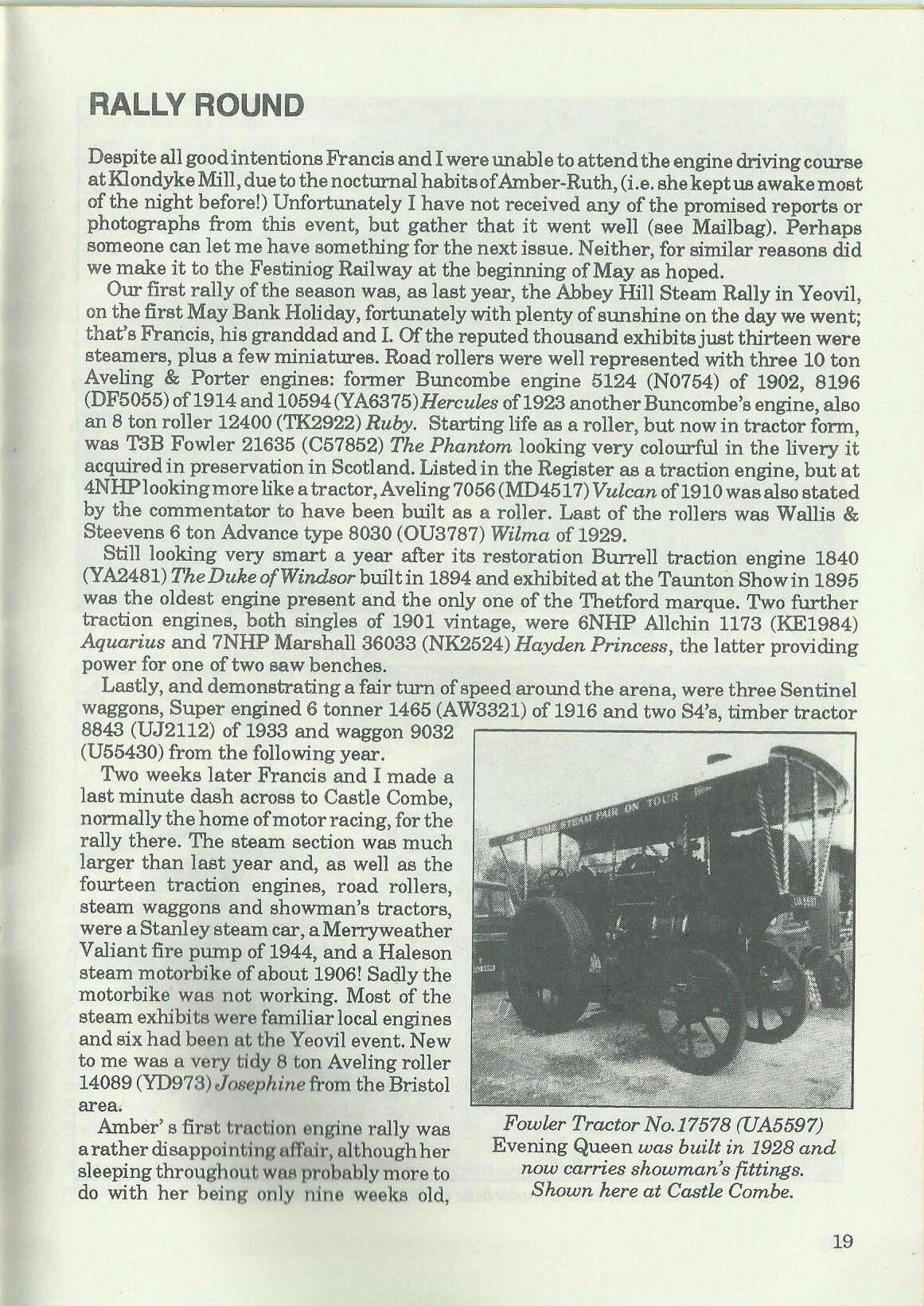 Despite all good intentions Francis and I were unable to attend the engine driving course atKlondykeMill,duetothenocturnalhabitsofAmber-Ruth,(i.e.shekeptusawakemost of the night before!) Unfortunately I have not received any of the promised reports or photographs from this event, but gather that it went well (see Mailbag). Perhaps someone can let me have something for the next issue. Neither, for similar reasons did we make it to the Festiniog Railway at the beginning of May as hoped.