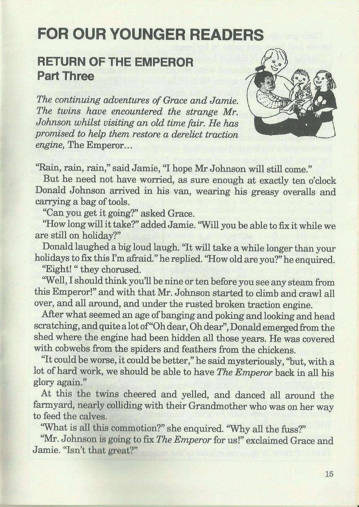 The continuing adventures of Grace and Jamie. The twins have encountered the strange Mr. Johnson whilst visiting an old time fair. He has promised to help them restore a derelict traction engine, The Emperor ...