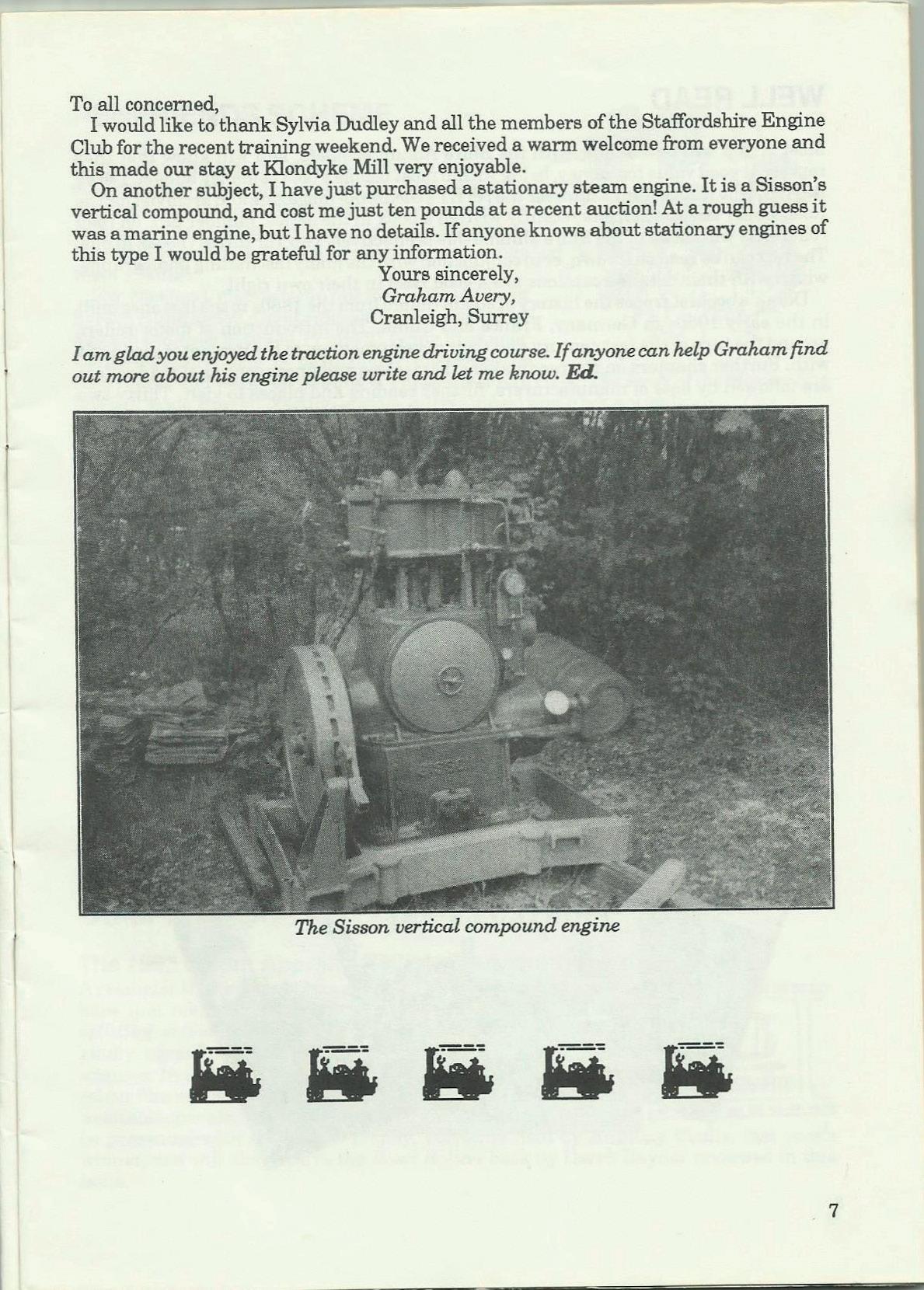 On another subject, I have just purchased a stationary steam engine. It is a Sisson's vertical compound, and cost me just ten pounds at a recent auction! At a rough guess it was a marine engine, but I have no details. If anyone knows about stationary engines of this type I would be grateful for any information.