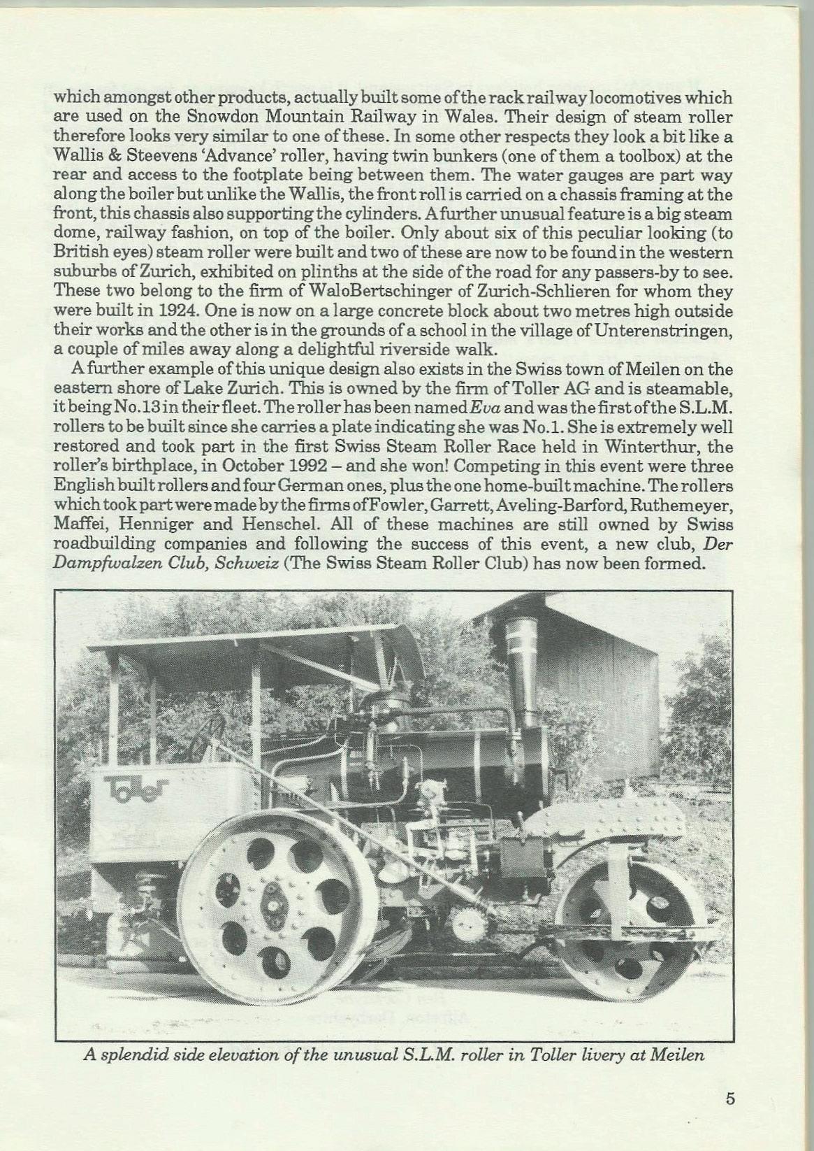 If any SAC member holidays in Switzerland, it is worth keeping an eye out for steam rollers parked up at the roadside or in parks since there are several of these to be found in various parts of the country. They do not suffer from vandalism there to the extent to which we do in Great Britain so that steam rollers left on exhibition in this way generally tend to remain intact and only suffer because of the weather conditions. The firm of WaloBertschinger, however, have a quite excellent policy of taking those in which they still have an interest, back to their works on a regular basis to refurbish them. Thus they keep them in good external appearance and the passers-by seem to appreciate this not inconsiderable effort on the part of the firm. Their S.L.M. type rollers, despite not being steamable, are in quite fair condition and worth seeking out for a close inspection because they are so very different.