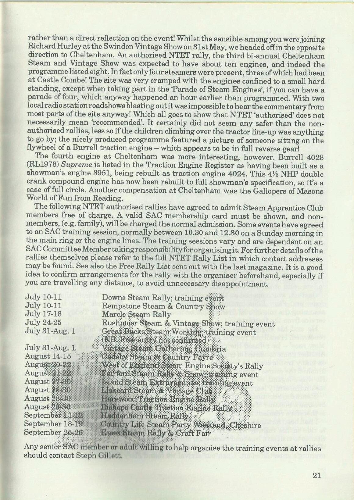 The following NTET authorised rallies have agreed to admit Steam Apprentice Club members free of charge. A valid SAC membership card must be shown, and nonmembers, (e.g. family), will be charged the normal admission. Some events have agreed to an SAC training session, normally between 10.30 and 12.30 on a Sunday morning in the main ring or the engine lines. The training sessions vary and are dependent on an SAC Committee Member taking responsibility for organising it. For further details of the rallies themselves please refer to the full NTET Rally List in which contact addresses may be found. See also the Free Rally List sent out with the last.magazine. It is a good idea to confirm arrangements for the rally with the organiser beforehand, especially if you are travelling any distance, to avoid unnecessary disappointment.