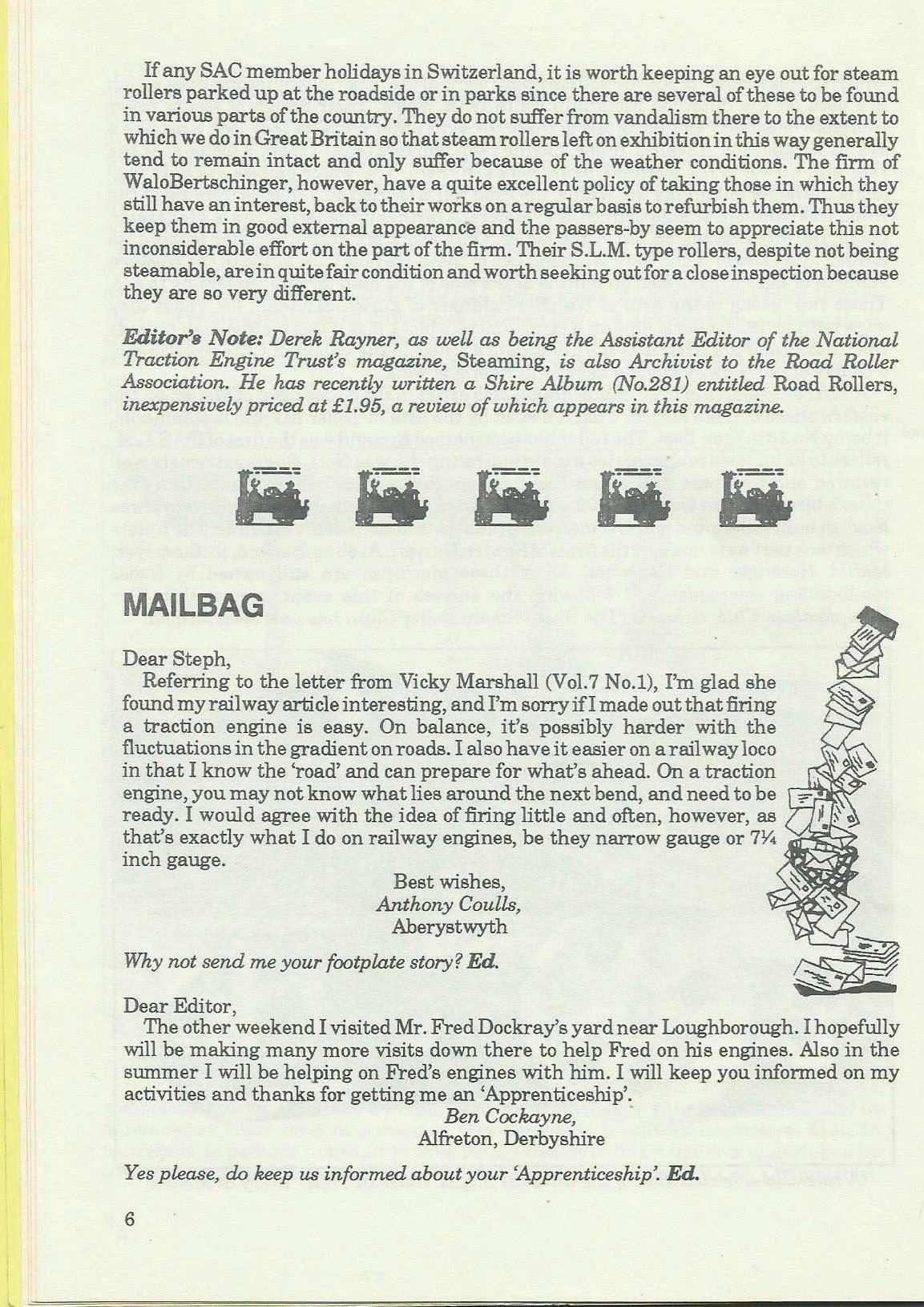 Referring to the letter from Vicky Marshall (Vol.7 No. l), I'm glad she found my railway article interesting, and I'm sorry if I made out that firing a traction engine is easy. On balance, it's possibly harder with the fluctuations in the gradient on roads. I also have it easier on a railway loco in that I know the 'road' and can prepare for what's ahead. On a traction engine, you may not know what lies around the next bend, and need to be ,------,,.i-"'J ready. I would agree with the idea of firing little and often, however, as that's exactly what I do on railway engines, be they narrow gauge or 7¼ inch gauge.