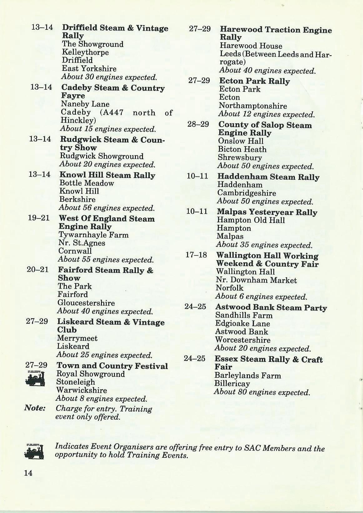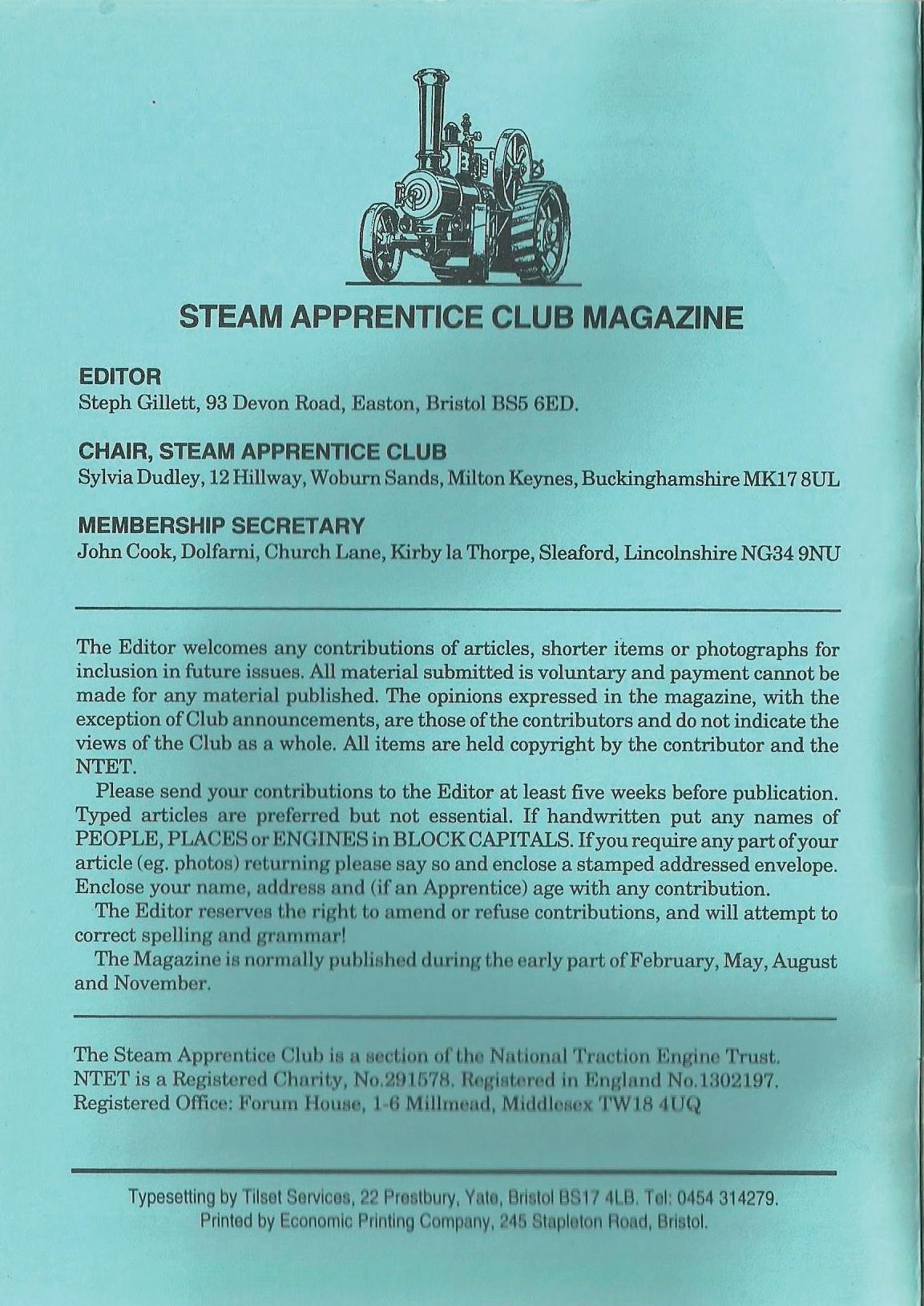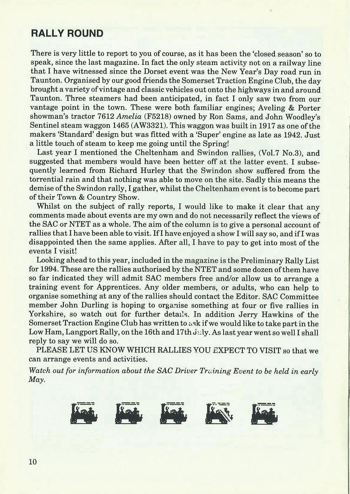 Looking ahead to this year, included in the magazine is the Preliminary Rally List for 1994. These are the rallies authorised by the NTET and some dozen of them have so far indicated they will admit SAC members free and/or allow us to arrange a training event for Apprentices. Any older members, or adults, who can help to organise something at any of the rallies should contact the Editor. SAC Committee member John Durling is hoping to organise something at four or five rallies in Yorkshire, so watch out for further details. In addition Jerry Hawkins of the Somerset Traction Engine Club has written to ~.,;;kifwe would like to take part in the Low Ham, LangportRally, on the 16th and 17thJlJy. Aslastyearwentsowell I shall reply to say we will do so.
