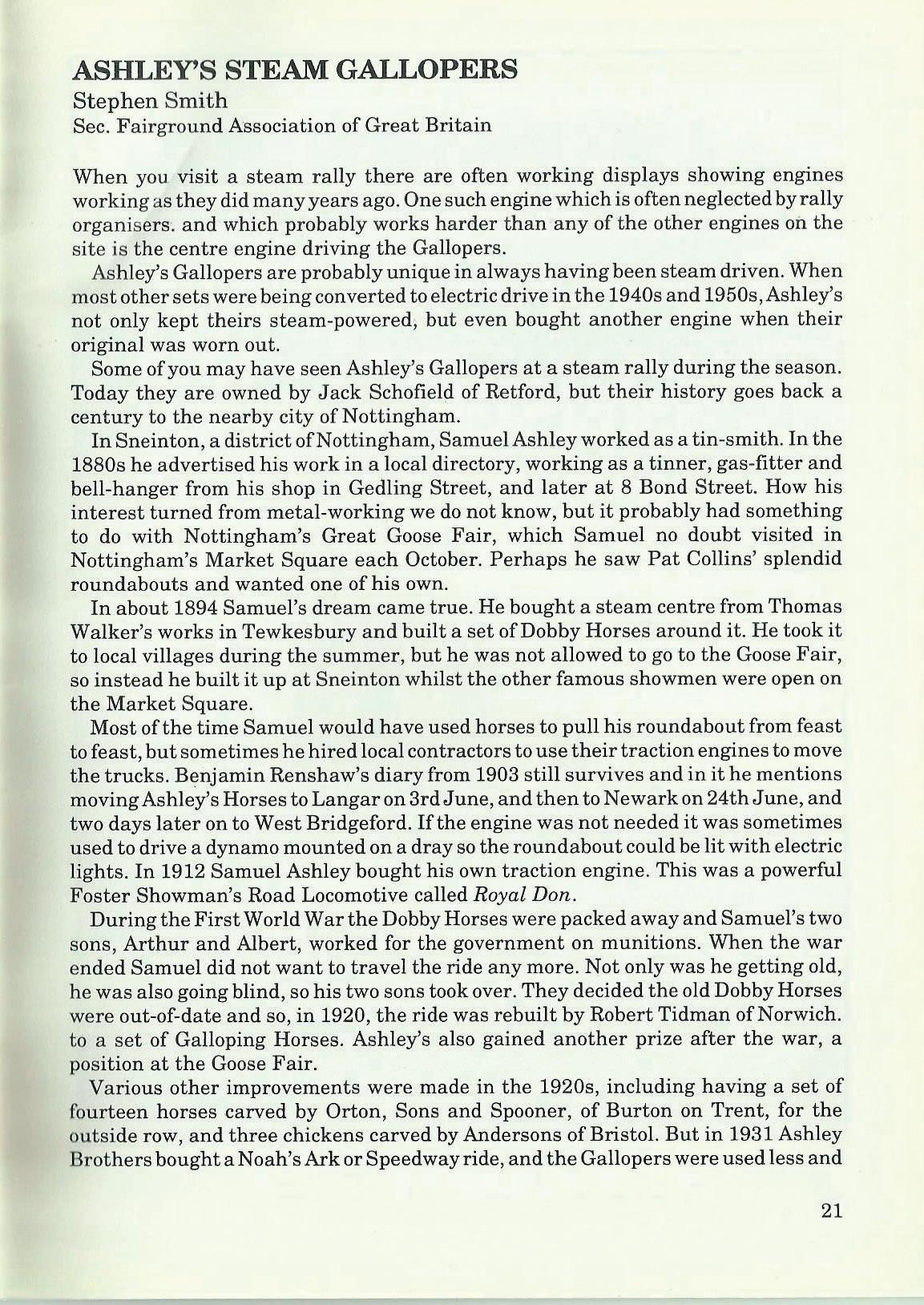 In Sneinton, a district ofN ottingham, Samuel Ashley worked as a tin-smith. In the 1880s he advertised his work in a local directory, working as a tinner, gas-fitter and bell-hanger from his shop in Gedling Street, and later at 8 Bond Street. How his interest turned from metal-working we do not know, but it probably had something to do with Nottingham's Great Goose Fair, which Samuel no doubt visited in Nottingham's Market Square each October. Perhaps he saw Pat Collins' splendid roundabouts and wanted one of his own.