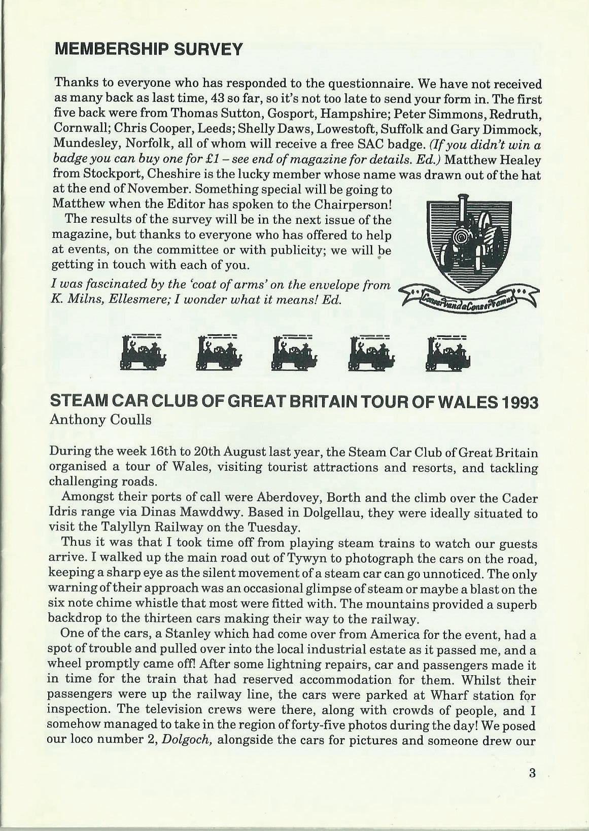 Thanks to everyone who has responded to the questionnaire. We have not received as many back as last time, 43 so far, so it's not too late to send your form in. The first five back were from Thomas Sutton, Gosport, Hampshire; Peter Simmons, Redruth, Cornwall; Chris Cooper, Leeds; Shelly Daws, Lowestoft, Suffolk and Gary Dimmock, Mundesley, Norfolk, all of whom will receive a free SAC badge. (If you didn't win a badge you can buy one for £1 - see end of magazine for details. Ed.) Matthew Healey from Stockport, Cheshire is the lucky member whose name was drawn out of the hat at the end of November. Something special will be going to Matthew when the Editor has spoken to the Chairperson!