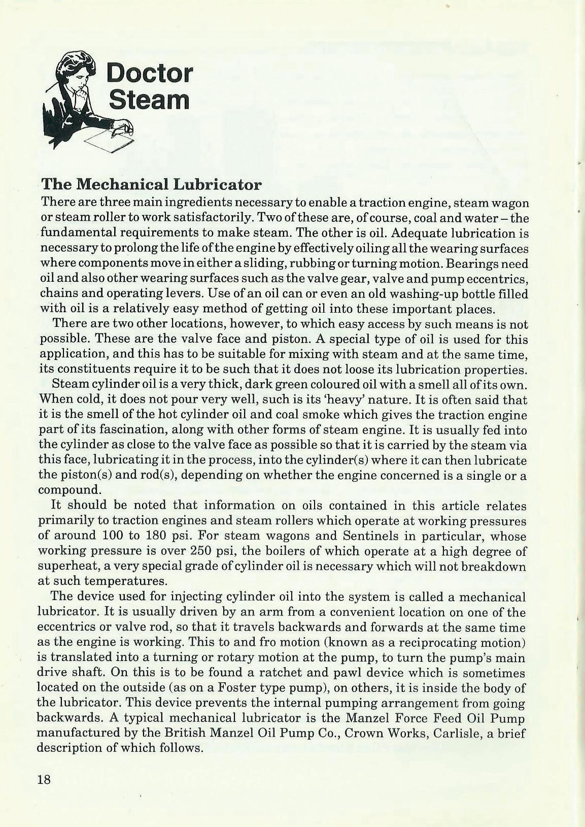 There are three main ingredients necessary to enable a traction engine, steam wagon or steam roller to work satisfactorily. Two of these are, of course, coal and water-the fundamental requirements to make steam. The other is oil. Adequate lubrication is necessary to prolong the life of the engine by effectively oiling all the wearing surfaces where components move in either a sliding, rubbing or turning motion. Bearings need oil and also other wearing surfaces such as the valve gear, valve and pump eccentrics, chains and operating levers. Use of an oil can or even an old washing-up bottle filled with oil is a relatively easy method of getting oil into these important places.