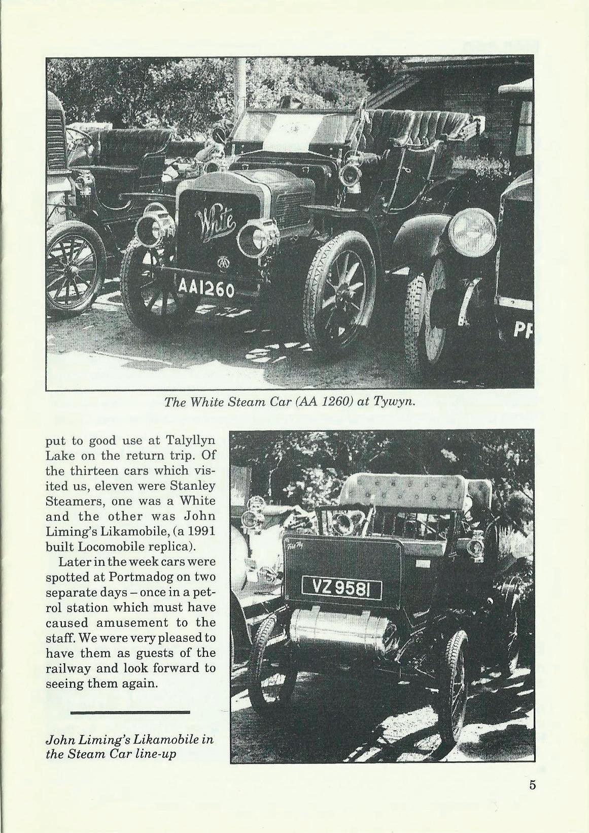 put to good use at Talyllyn Lake on the return trip. Of the thirteen cars which visited us, eleven were Stanley Steamers, one was a White and the other was John Liming's Likamobile, (a 1991 built Locomobile replica).