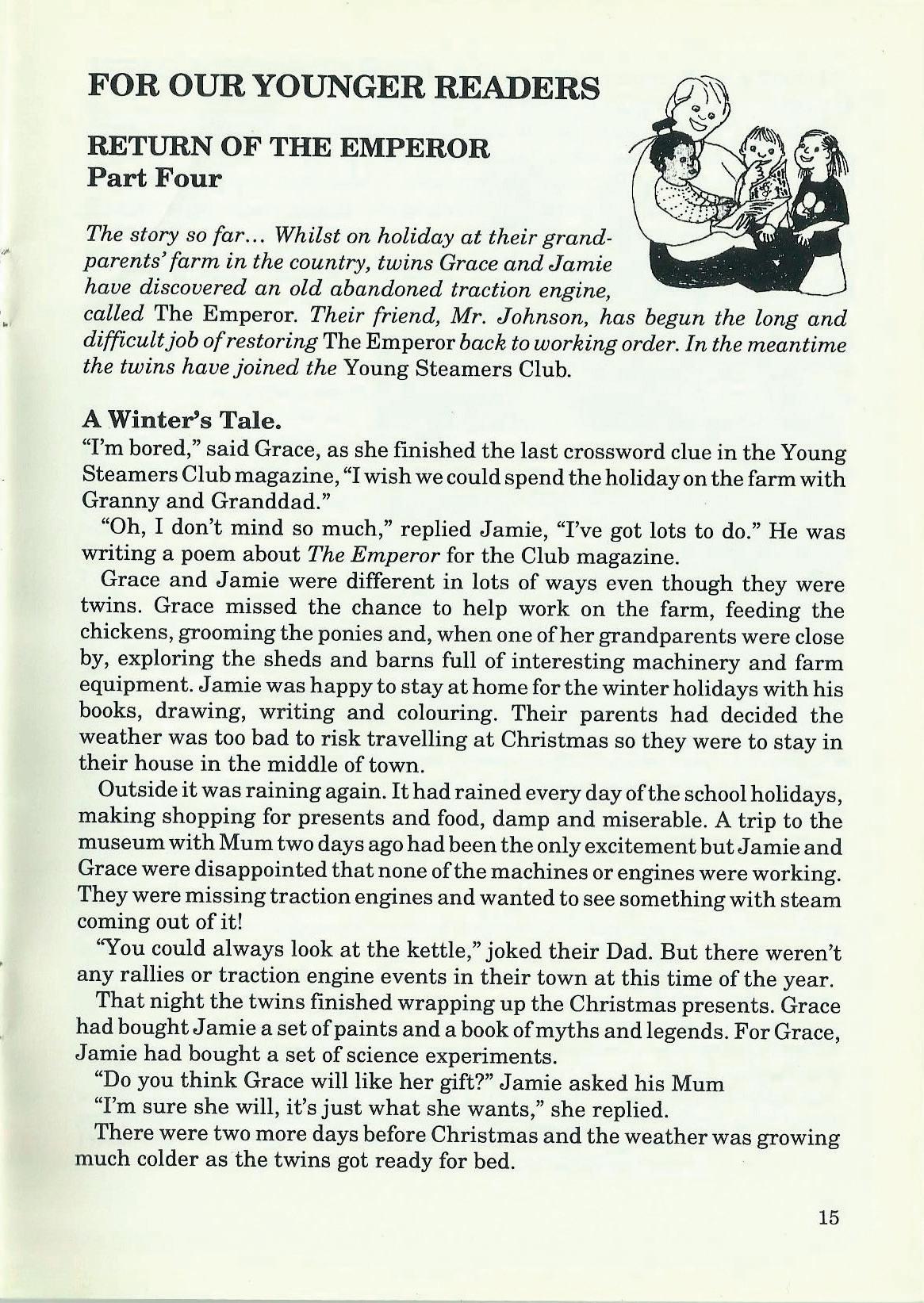 The story so far ... Whilst on holiday at their grandparents' farm in the country, twins Grace and Jamie have discovered an old abandoned traction engine, called The Emperor. Their friend, Mr. Johnson, has begun the long and difficult job of restoring The Emperor back to working order. In the meantime the twins have joined the Young Steamers Club.