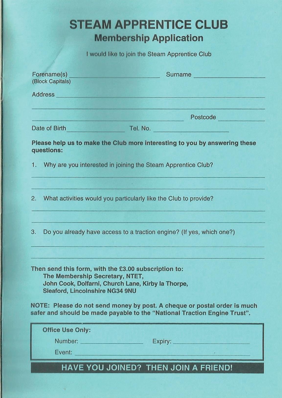 NOTE: Please do not send money by post. A cheque or postal order is much safer and should be made payable to the "National Traction Engine Trust".