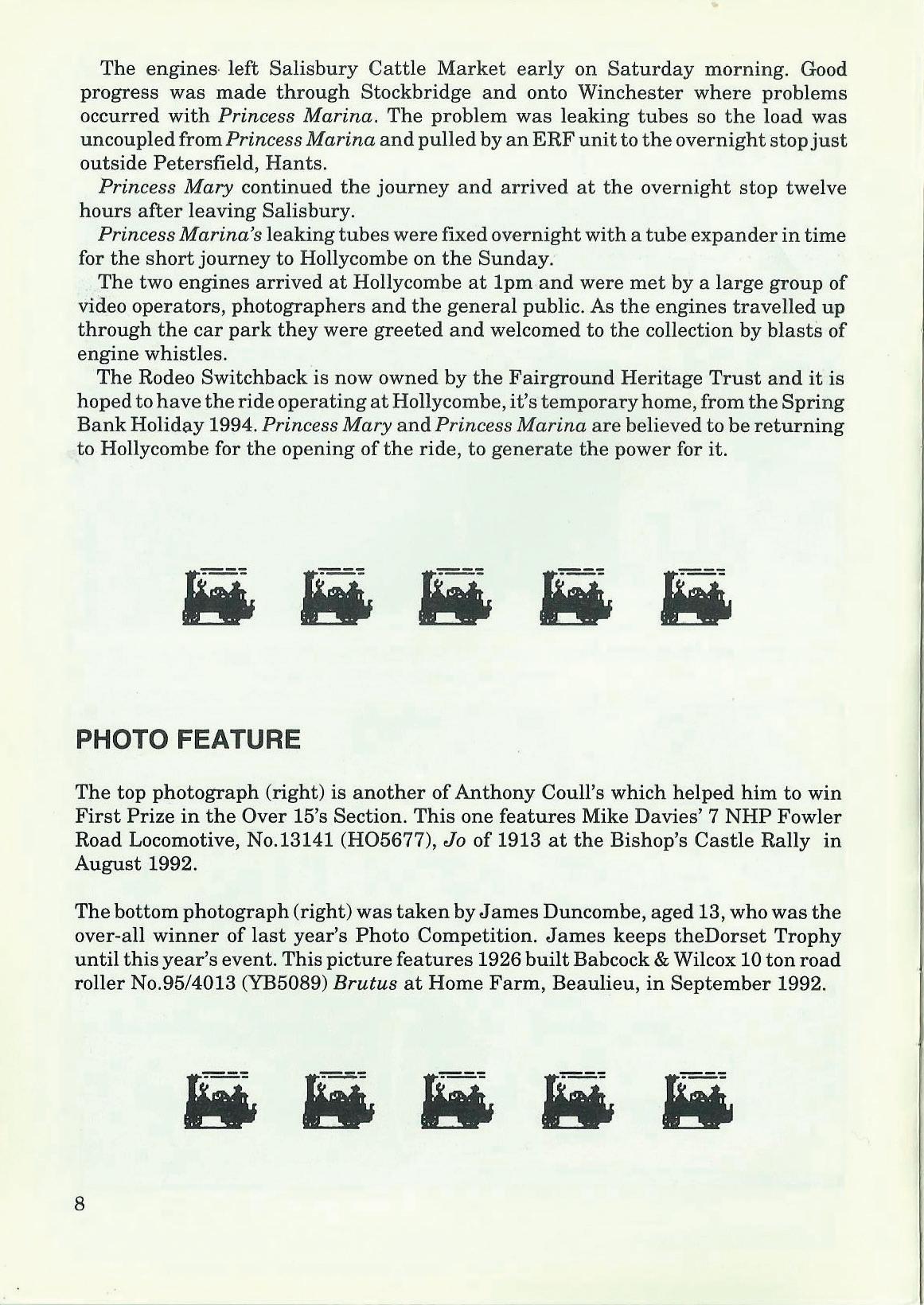 The bottom photograph (right) was taken by James Duncombe, aged 13, who was the over-all winner of last year's Photo Competition. James keeps theDorset Trophy until this year's event. This picture features 1926 built Babcock & Wilcox 10 ton road roller No.95/4013 (YB5089) Brutus at Home Farm, Beaulieu, in September 1992.