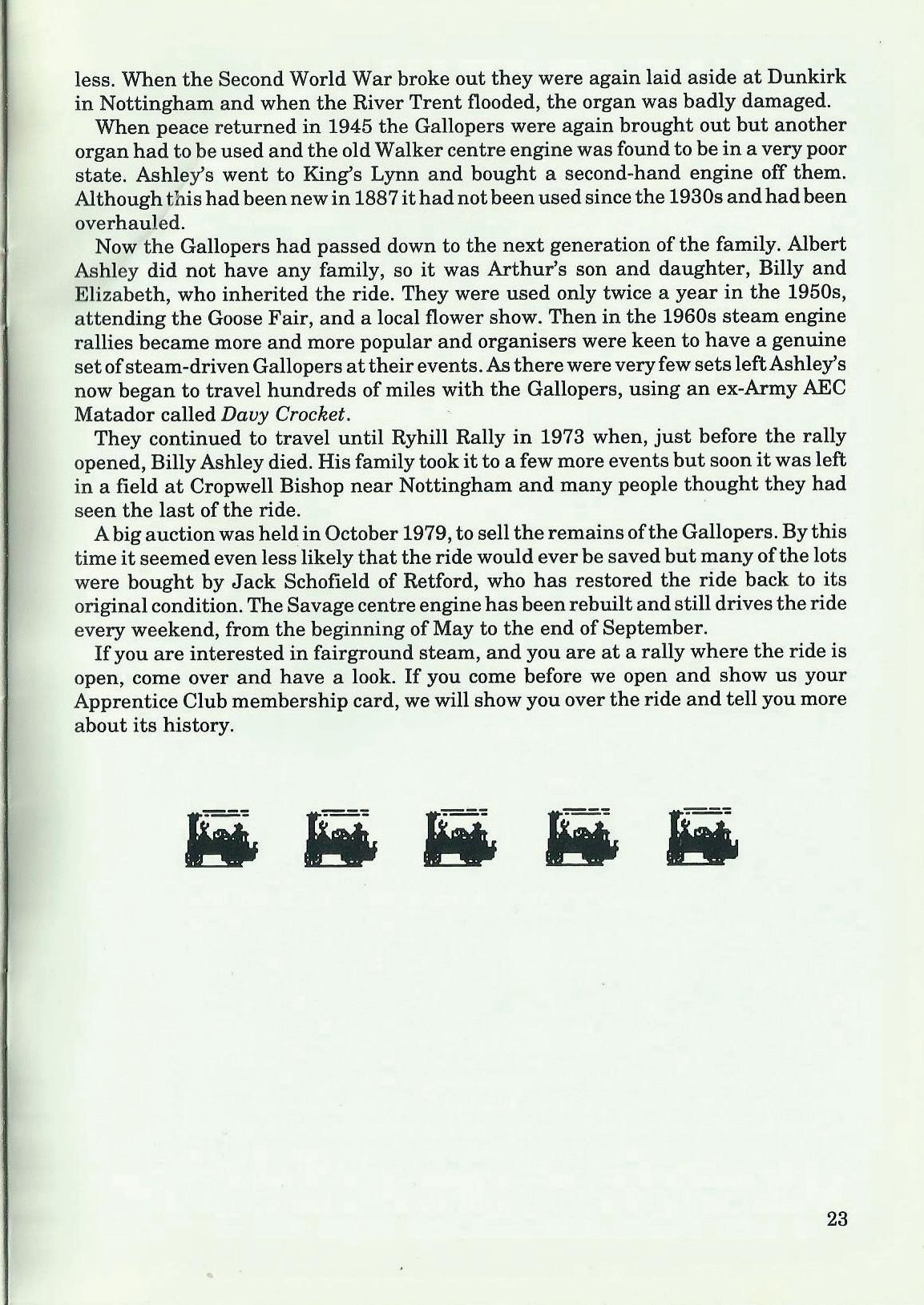 less. When the Second World War broke out they were again laid aside at Dunkirk in Nottingham and when the River Trent flooded, the organ was badly damaged. When peace returned in 1945 the Gallopers were again brought out but another organ had to be used and the old Walker centre engine was found to be in a very poor state. Ashley's went to King's Lynn and bought a second-hand engine off them. Although this had been new in 1887 it had not been used since the 1930s and had been overhauled.