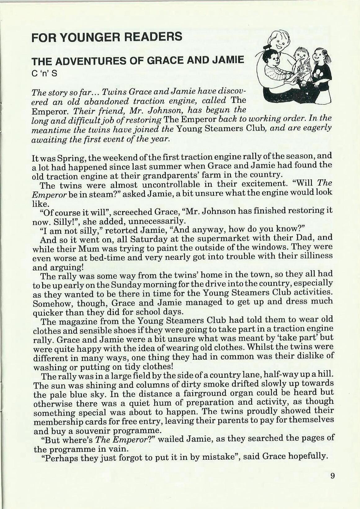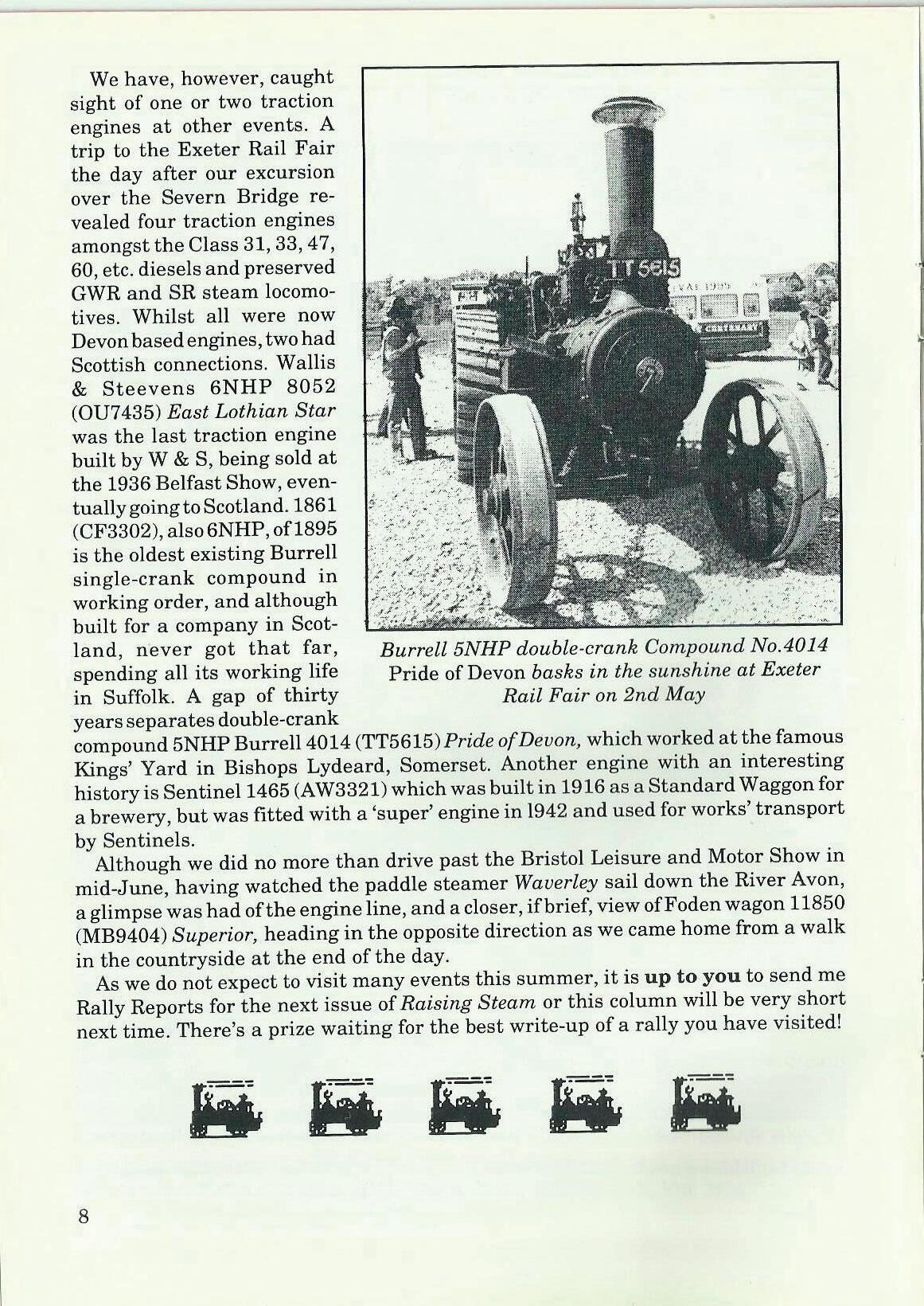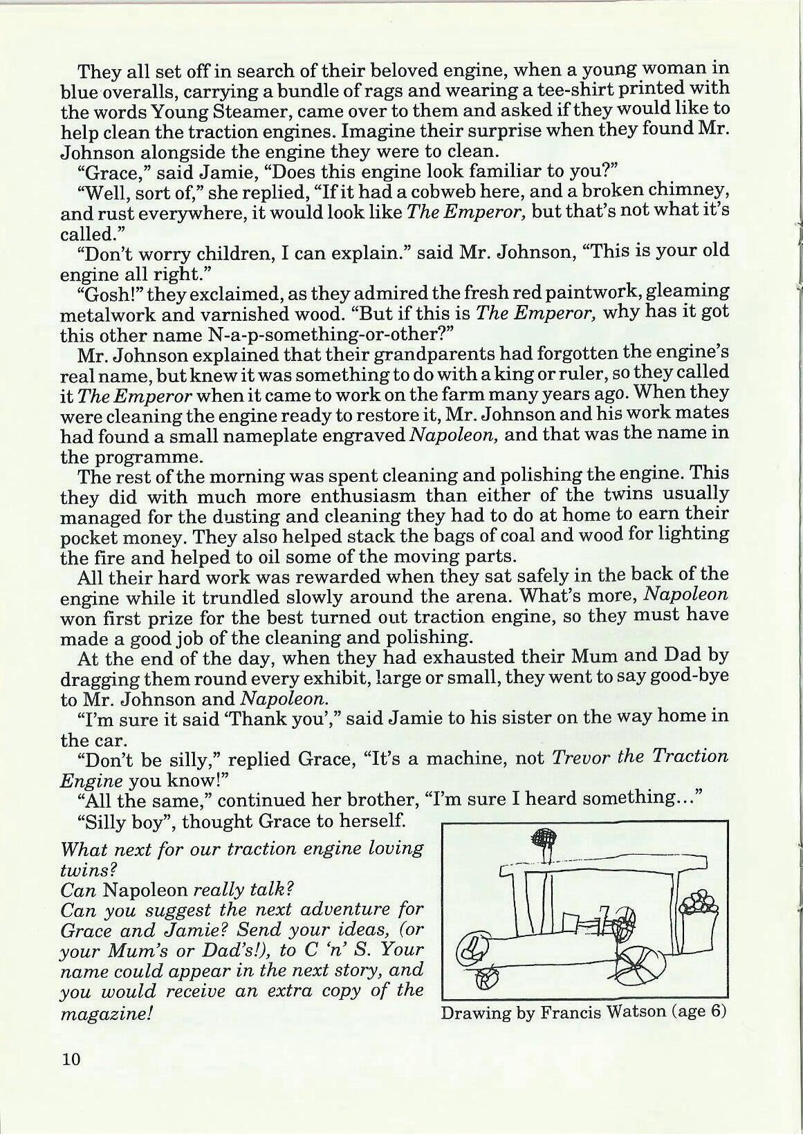 The next issue will now be the "Late Summer" issue. I hope that this will have as much news as possible from the rallies you have been to over the summer. So, to encourage you, there will be a prize for the best report we print. The prize will take into account age, how quickly you get it to me after the rally, and how interesting it is. It isn't a spelling competition, and younger members are welcome to get help from their parents, so I hope to get something from everyone! We will print them all! Anyone who does send in an article, letter or photograph will receive an extra copy of the magazine it is in-for your best friend, Mum, Dad, teacher, Aunt or Uncle, or you! If you can't think of anything to send in, why not try and get your favourite engine owner to scribble something on the back of a postcard for me ... ?