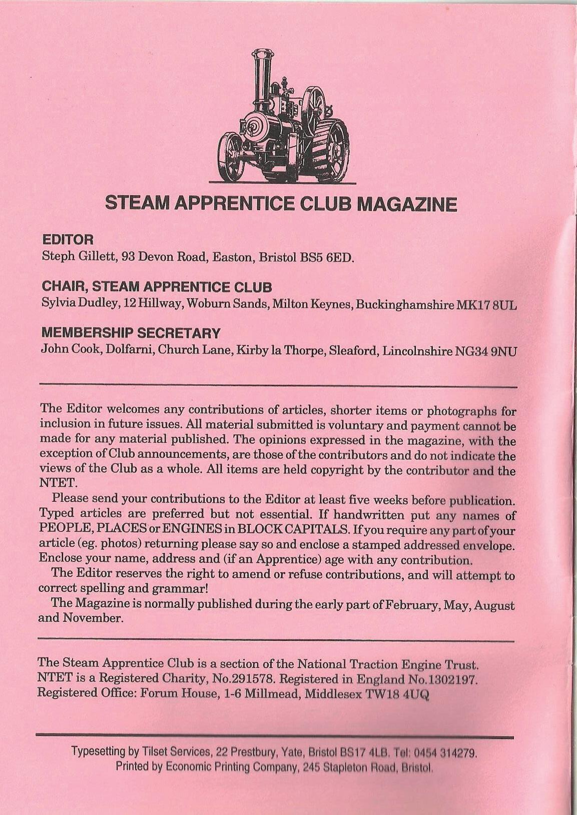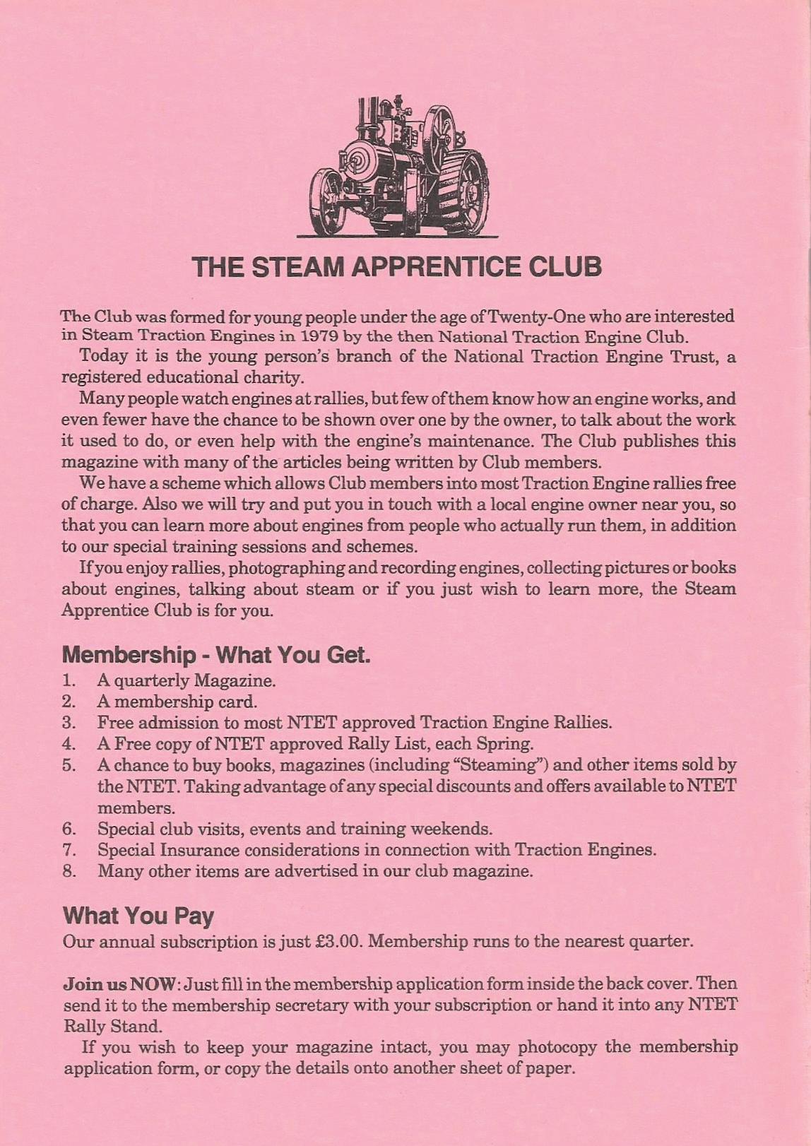 The Steam Apprentice Club is a section of the National Traction Engine Trust. NTET is a Registered Charity, No.291578. Registered in England No. L302197. Registered Office: Forum House, 1-6 Millmead, Middlesex TW18 4 UQ