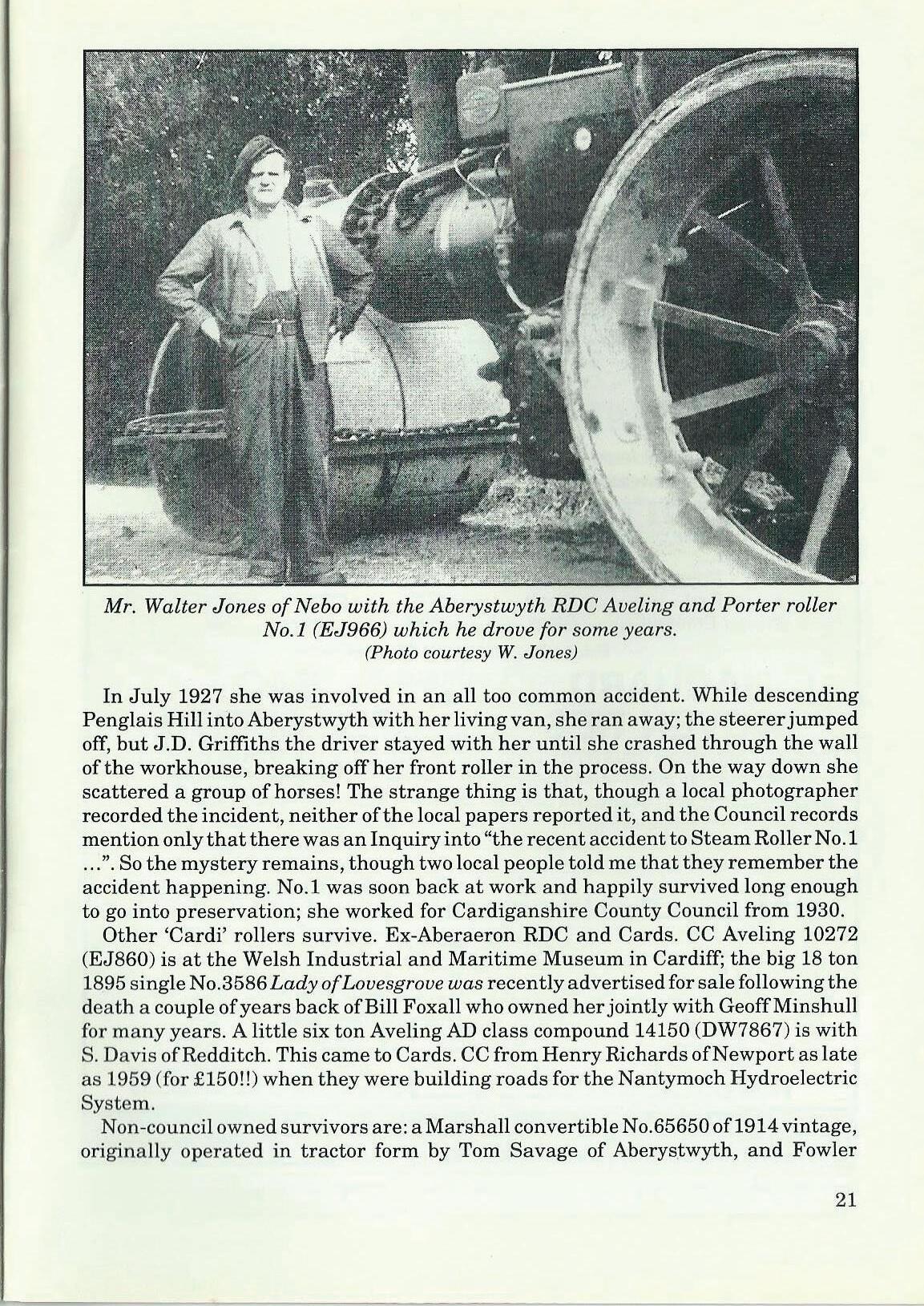 In July 1927 she was involved in an all too common accident. While descending Penglais Hill into Aberystwyth with her living van, she ran away; the steerer jumped off, but J.D. Griffiths the driver stayed with her until she crashed through the wall of the workhouse, breaking off her front roller in the process. On the way down she scattered a group of horses! The strange thing is that, though a local photographer recorded the incident, neither of the local papers reported it, and the Council records mention only that there was an Inquiry into "the recent accident to Steam Roller No.1 ... ". So the mystery remains, though two local people told me that they remember the accident happening. No.1 was soon back at work and happily survived long enough to go into preservation; she worked for Cardiganshire County Council from 1930.