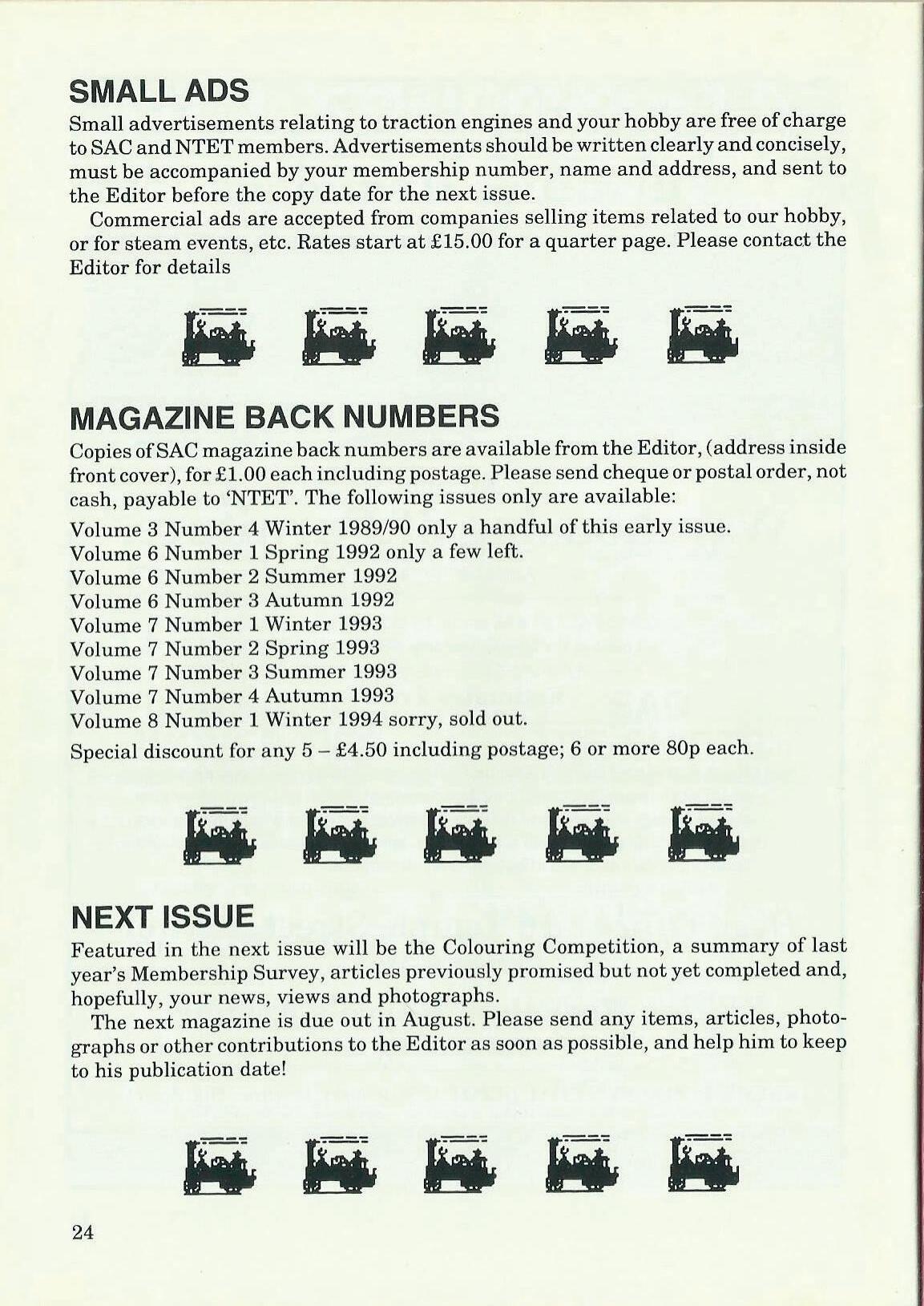 Small advertisements relating to traction engines and your hobby are free of charge to SAC and NTET members. Advertisements should be written clearly and concisely, must be accompanied by your membership number, name and address, and sent to the Editor before the copy date for the next issue.