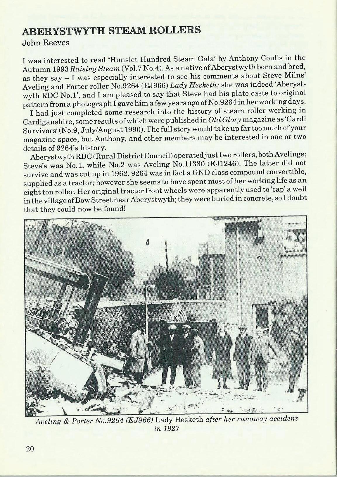 I was interested to read 'Hunslet Hundred Steam Gala' by Anthony Coulls in the Autumn 1993 Raising Steam (Vol.7 No.4). As a native of Aberystwyth born and bred, as they say - I was especially interested to see his comments about Steve Milns' Aveling and Porter roller No.9264 (EJ966) Lady Hesketh; she was indeed 'Aberystwyth RDC No.l', and I am pleased to say that Steve had his plate caste to original pattern from a photograph I gave him a few years ago ofN o.9264 in her working days.