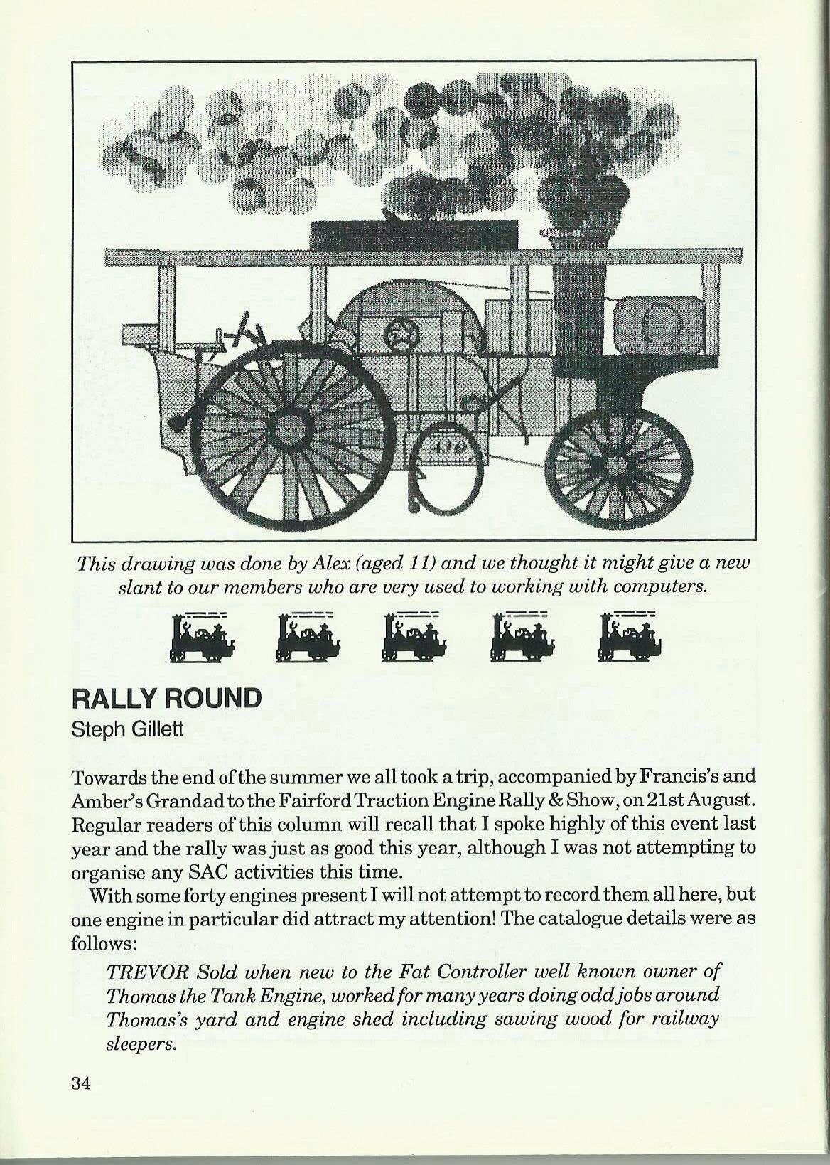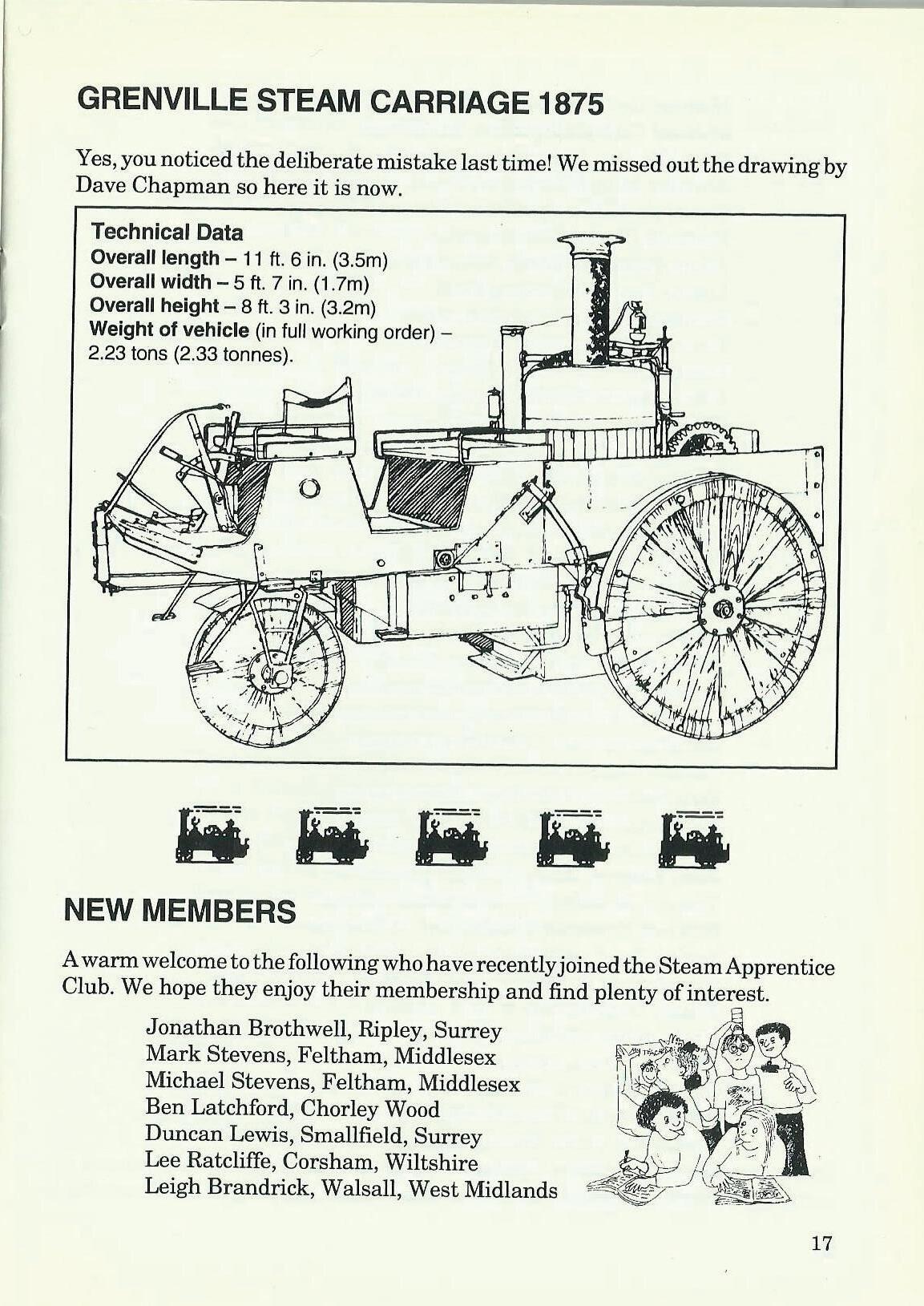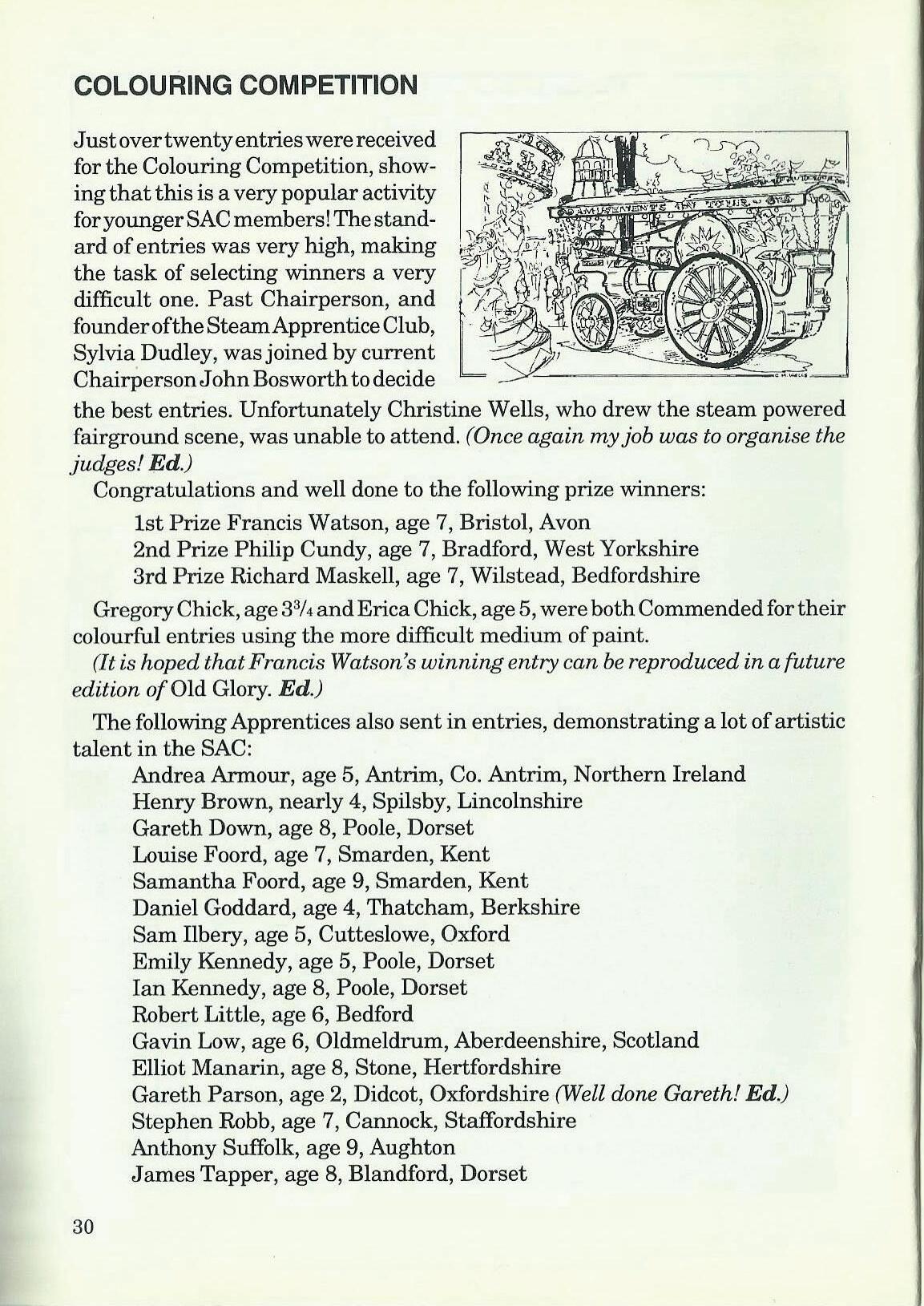 Another task that I have not been very successful with is in placing Steam Apprentices with engine owners, though I have managed to link up a few people. I am very pleased to say that our new Chairperson, John Bosworth, has agreed to take on the job of arranging'Apprenticeships', and hope that more bf you will be able to have a more practical involvement with traction engines. As John is an engine owner himself, (something I am sadly not), he understands the practical difficulties, and can talk to other engine owners better than I can. All Steam Apprentices who have asked to be placed with an engine will be hearing from us shortly. I must point out again though, that, for practical and insurance reasons, we can only operate the Apprenticeship scheme for members aged 12 years or over. See John's article for details of other activities which he is arranging.