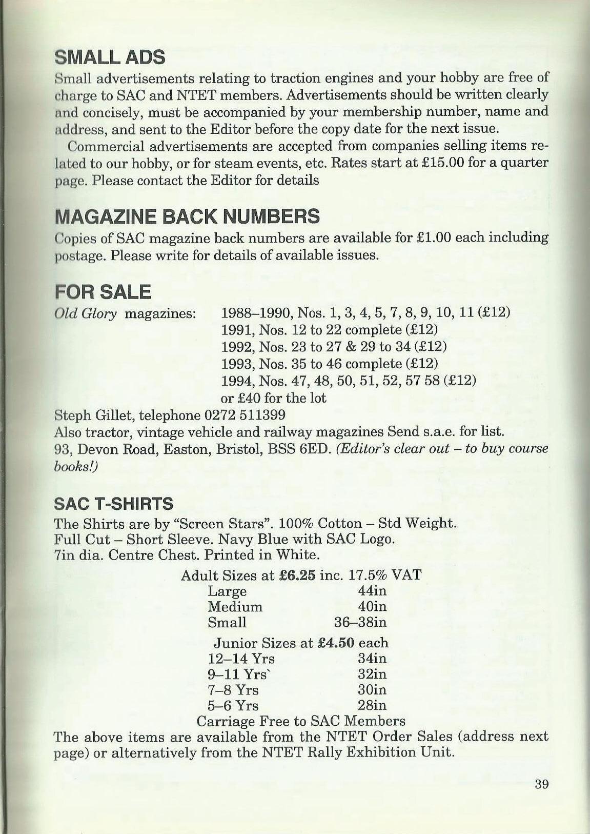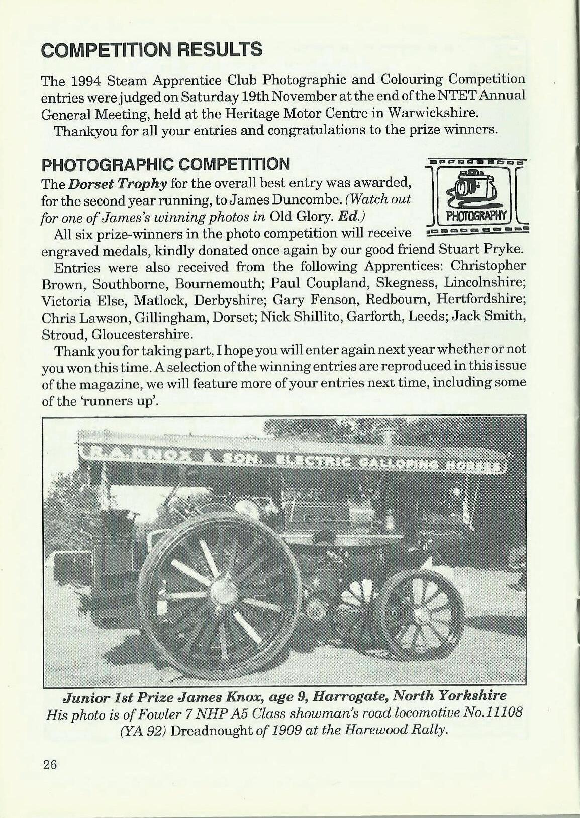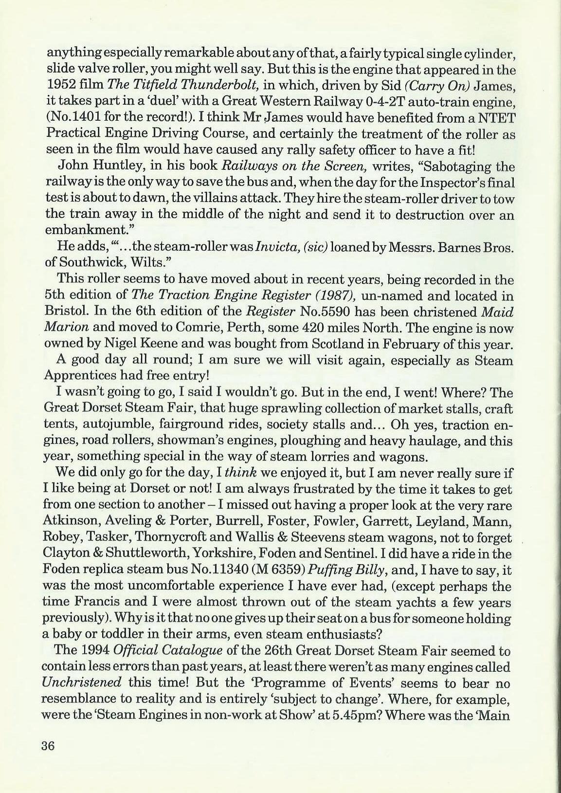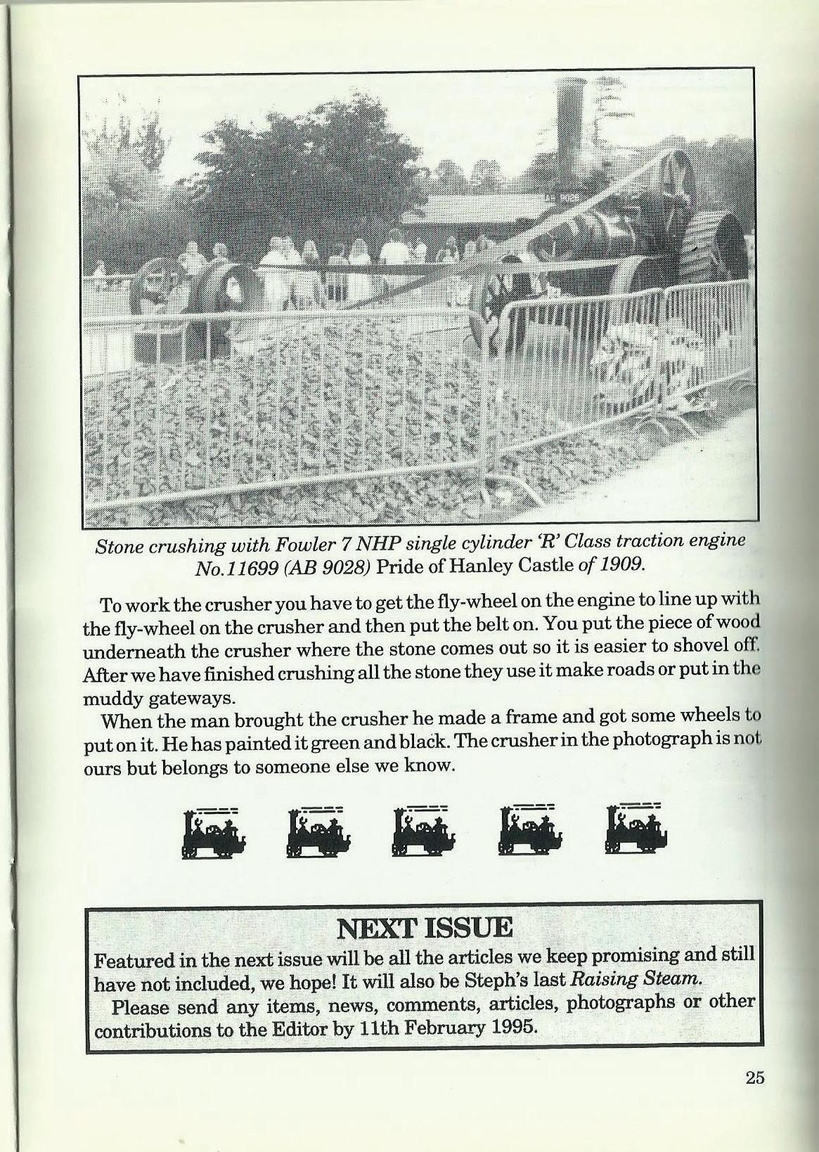 Another task that I have not been very successful with is in placing Steam Apprentices with engine owners, though I have managed to link up a few people. I am very pleased to say that our new Chairperson, John Bosworth, has agreed to take on the job of arranging'Apprenticeships', and hope that more bf you will be able to have a more practical involvement with traction engines. As John is an engine owner himself, (something I am sadly not), he understands the practical difficulties, and can talk to other engine owners better than I can. All Steam Apprentices who have asked to be placed with an engine will be hearing from us shortly. I must point out again though, that, for practical and insurance reasons, we can only operate the Apprenticeship scheme for members aged 12 years or over. See John's article for details of other activities which he is arranging.