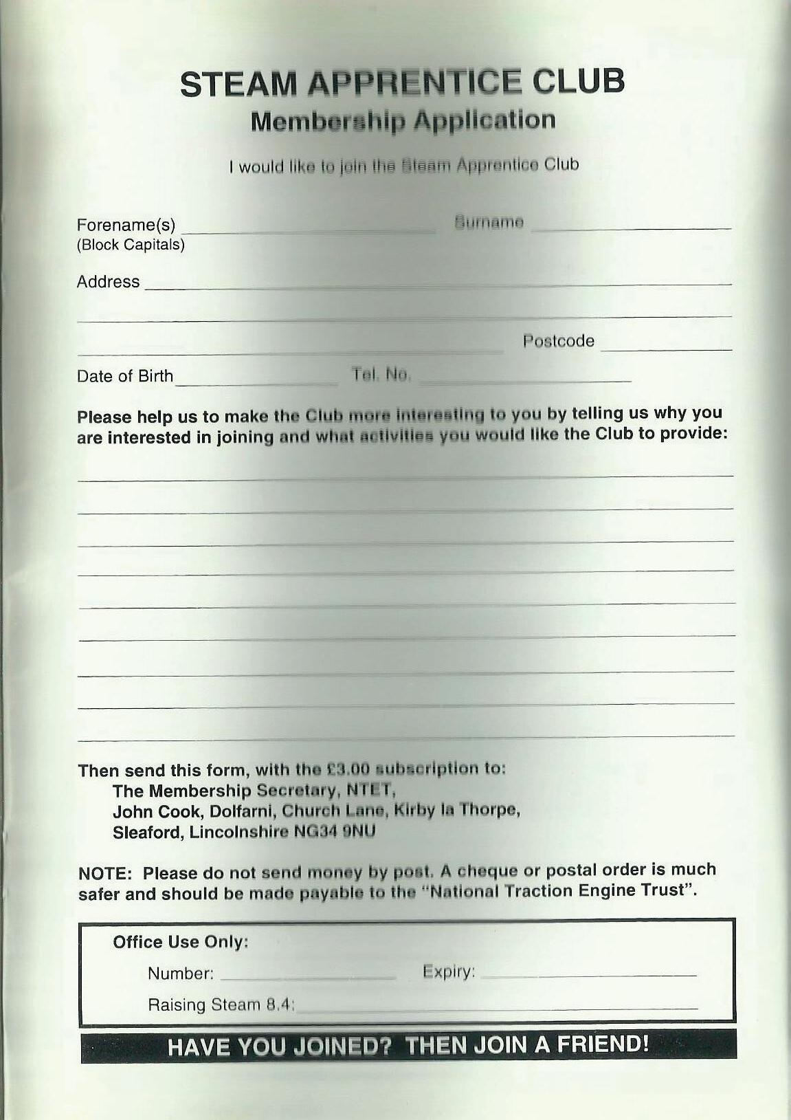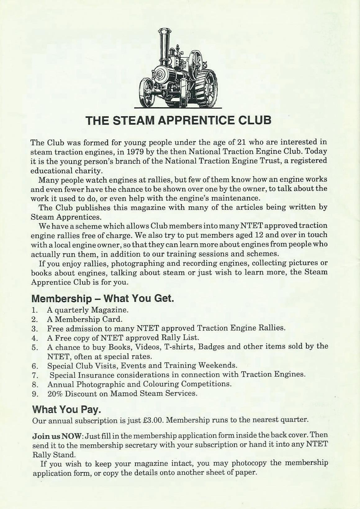 The Steam Apprentice Club is a section of the National Traction Engine 'I'rw1I.. NTET is a Registered Charity, No.291578. Registered in England No.1:m21fl'7. Registered Office: Forum House, 1-6 Millmead, Middlesex TW18 4UQ