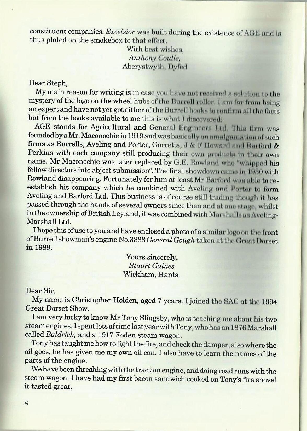 I hope this of use to you and have enclosed a photo of a sirn'il11rlogo 1111I he•front of Burrell showman's engine No.3888 General Gough taken nt U1cC n II t, I >orset in 1989.