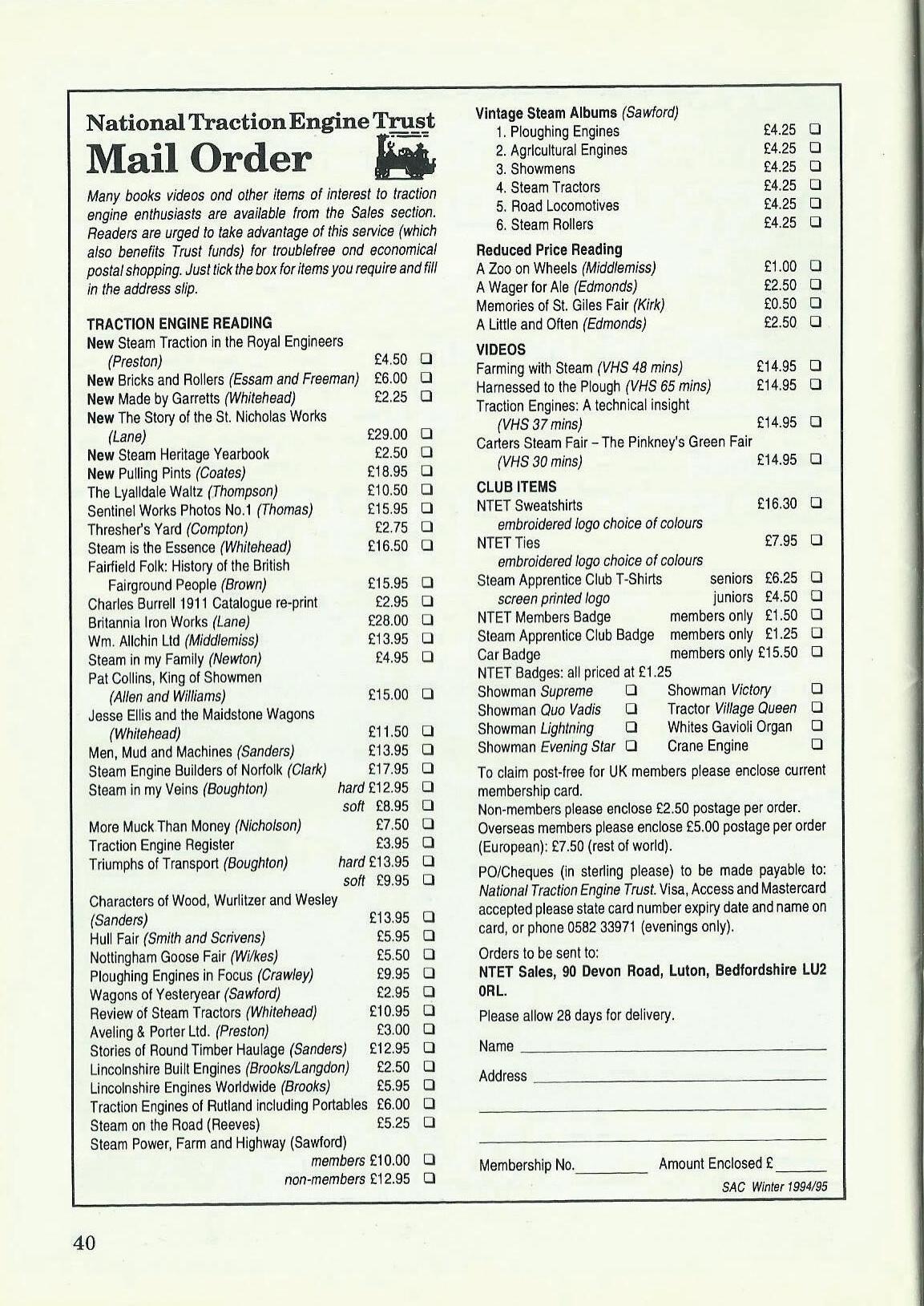 PO/Cheques(in sterlingplease)to be made payableto: NationalTractionEngineTrust.Visa,AccessandMastercard acceptedpleasestatecardnumberexpirydateandnameon card,or phone058233971(eveningsonly).