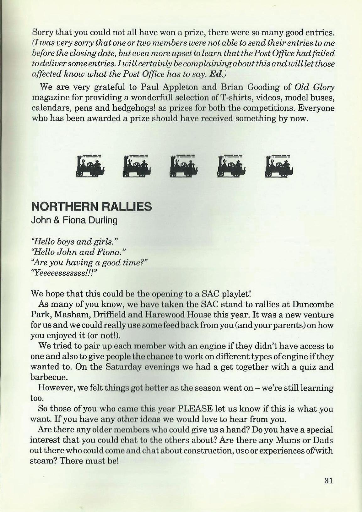 Please send your contributions to the Editor at least five weeks before publicalion. Typed articles are preferred but not essential. If handwritten put any names of PEOPLE,PLACESorENGINESinBLOCKCAPITALS.Ifyourequireanyparlofyour article (eg. photos) returning please say so and enclose a stamped addressed envelope. Enclose your name, address and (if an Apprentice) age with any contribution.