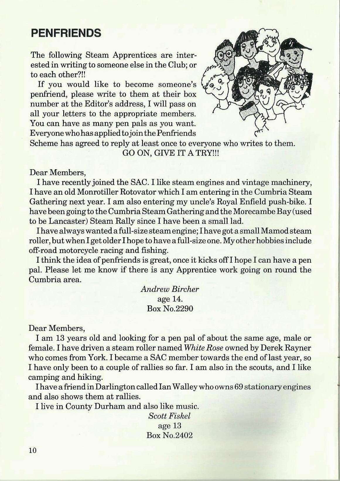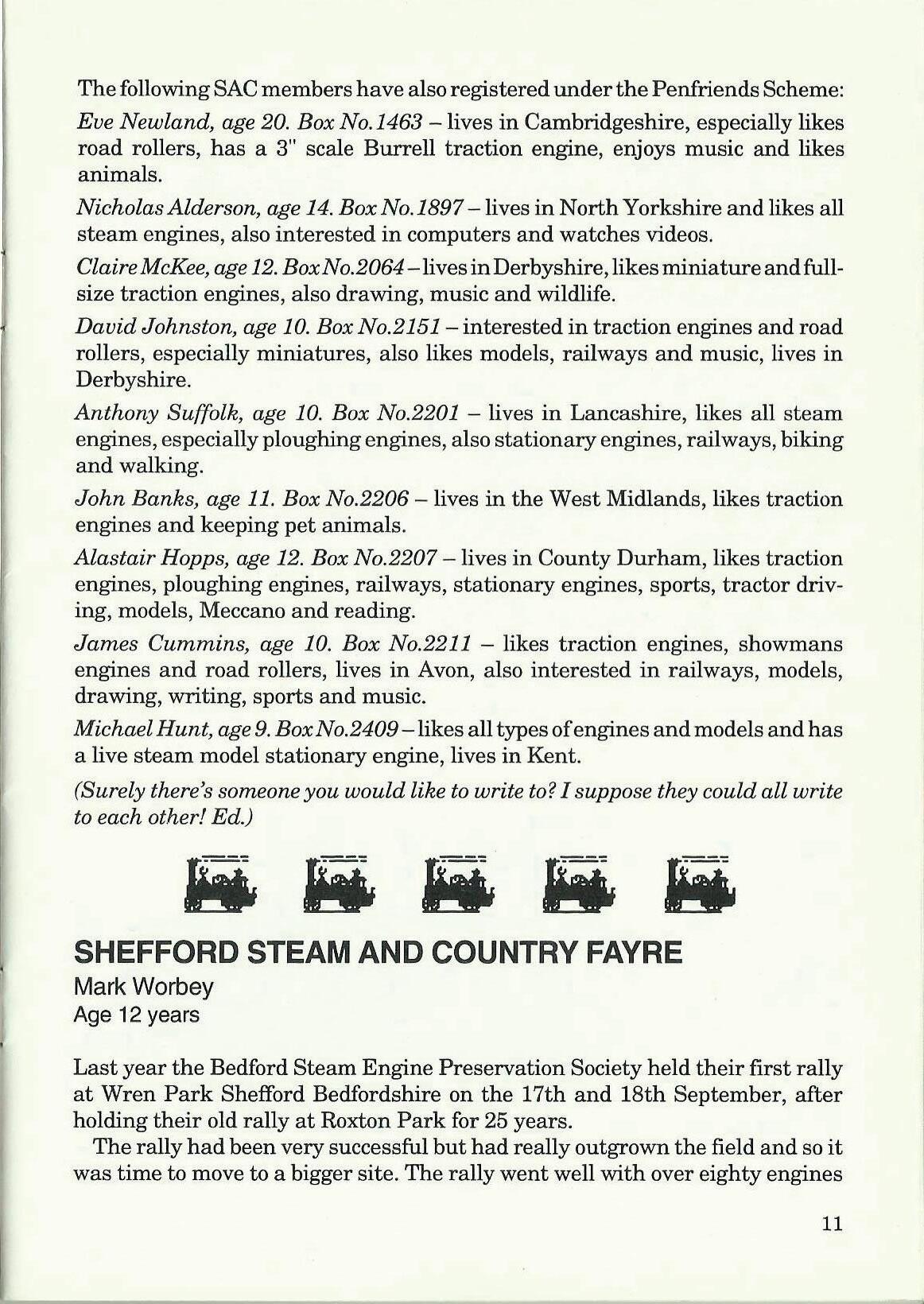 I am 13 years old and looking for a pen pal of about the same age, male or female. I have driven a steam roller named White Rose owned by Derek Rayner who comes from York. I became a SAC member towards the end of last year, so I have only been to a couple of rallies so far. I am also in the scouts, and I like camping and hiking.