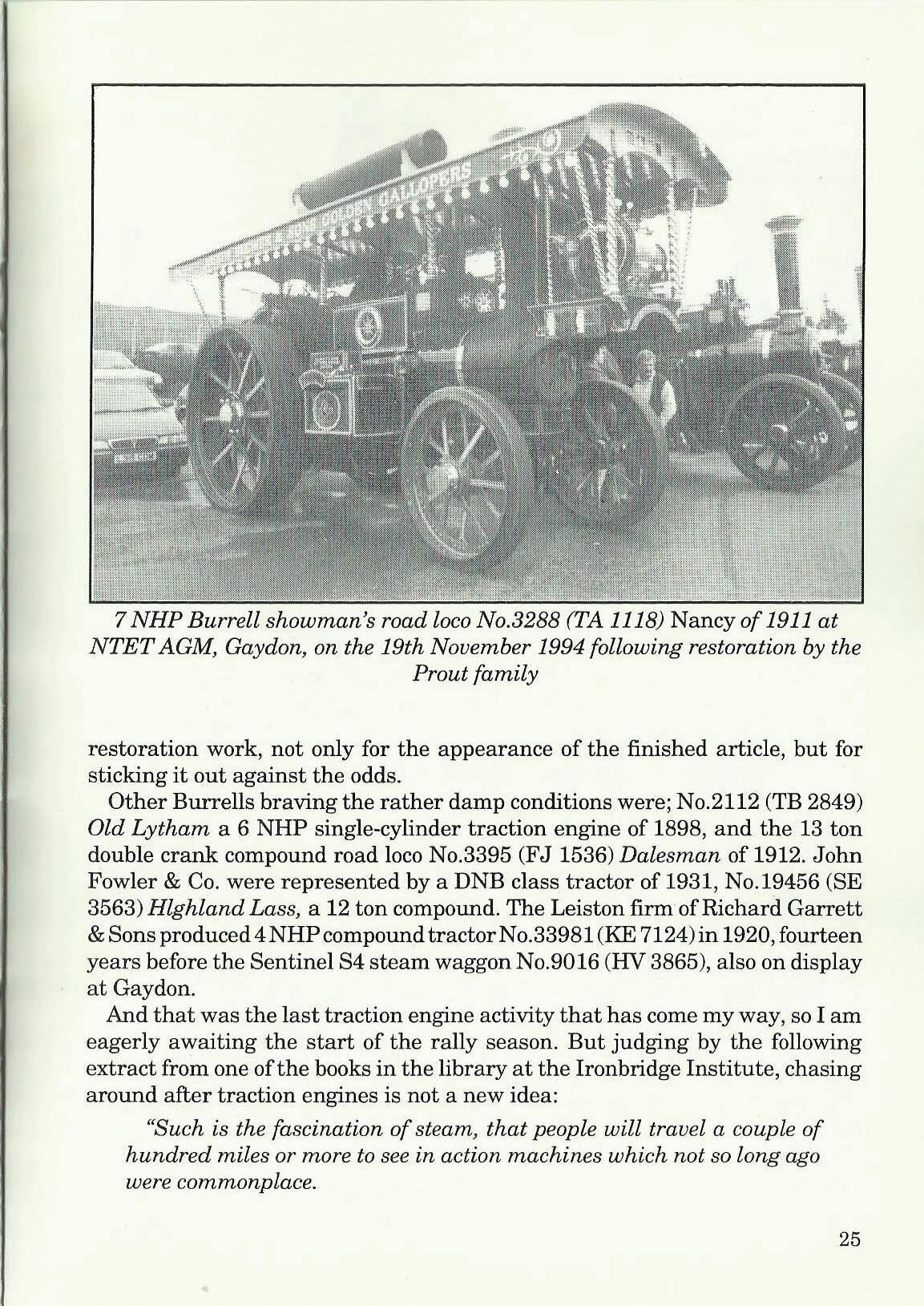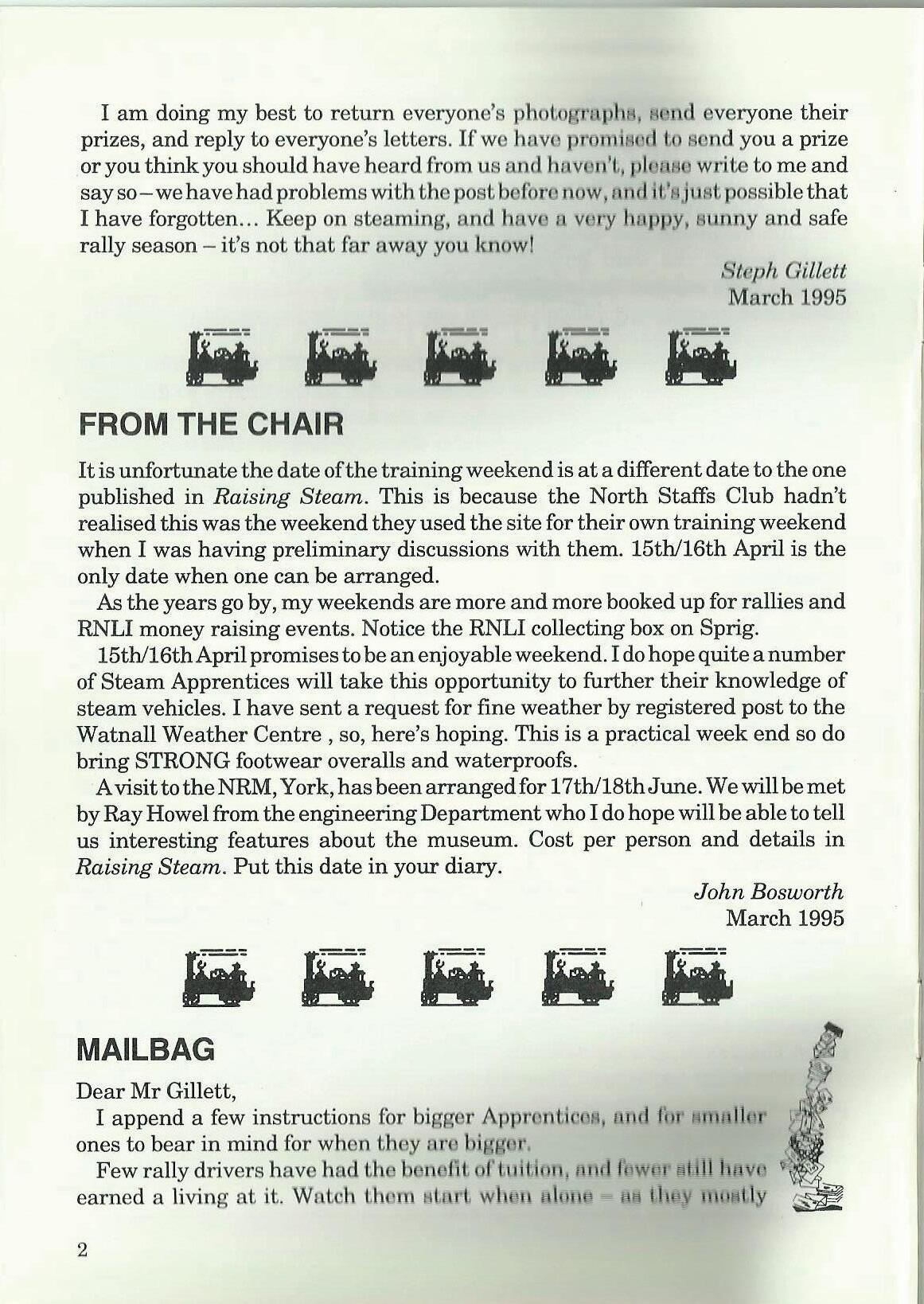 AB the years go by, my weekends are more and more booked up for rallies and RNLI money raising events. Notice the RNLI collecting box on Sprig. 15th/16thApril promises to be an enjoyable weekend. I do hope quite a number of Steam Apprentices will take this opportunity to further their knowledge of steam vehicles. I have sent a request for fine weather by registered post to the Watnall Weather Centre, so, here's hoping. This is a practical week end so do bring STRONG footwear overalls and waterproofs.