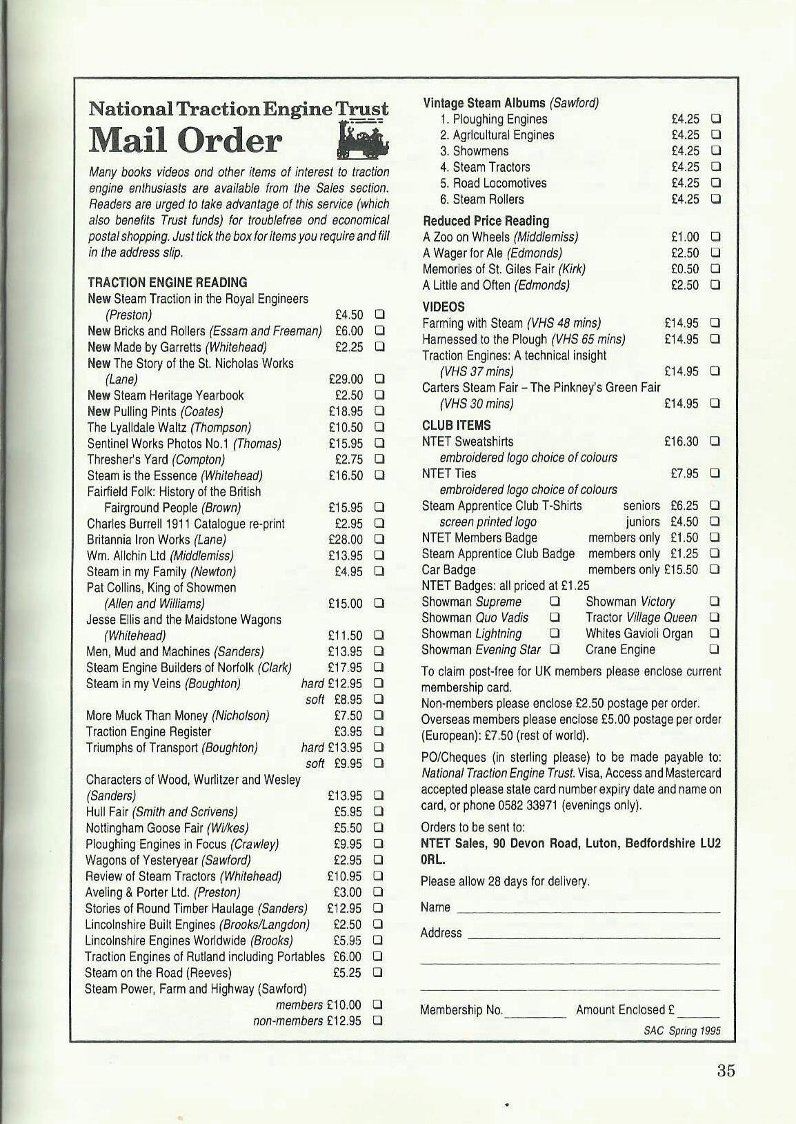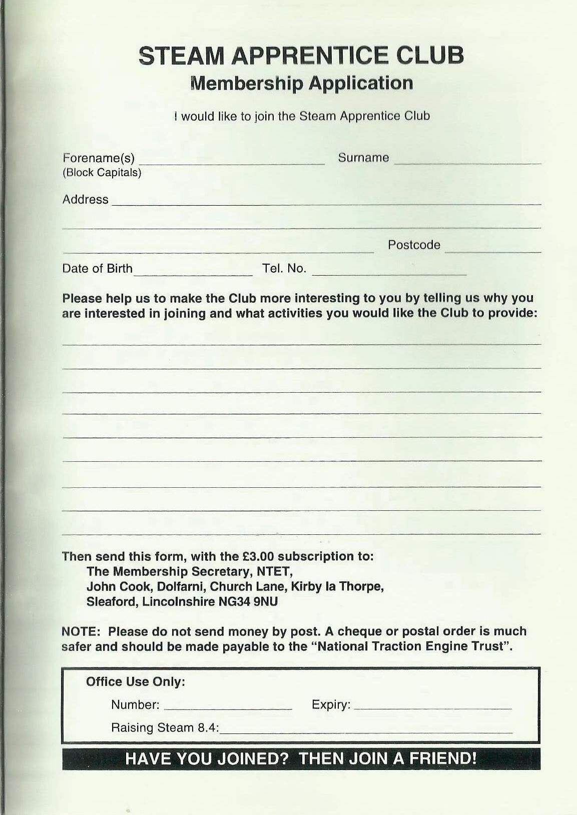 NOTE: Please do not send money by post. A cheque or postal order is much safer and should be made payable to the "National Traction Engine Trust".