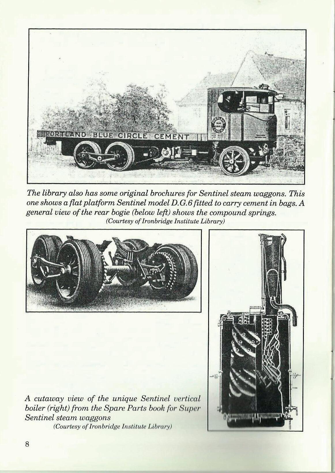 The library also has some original brochures for Sentinel steam waggons. This one shows a fiat platform Sentinel model D. G.6 fitted to carry cement in bags. A general view of the rear bogie (below left) shows the compound spri~gs.