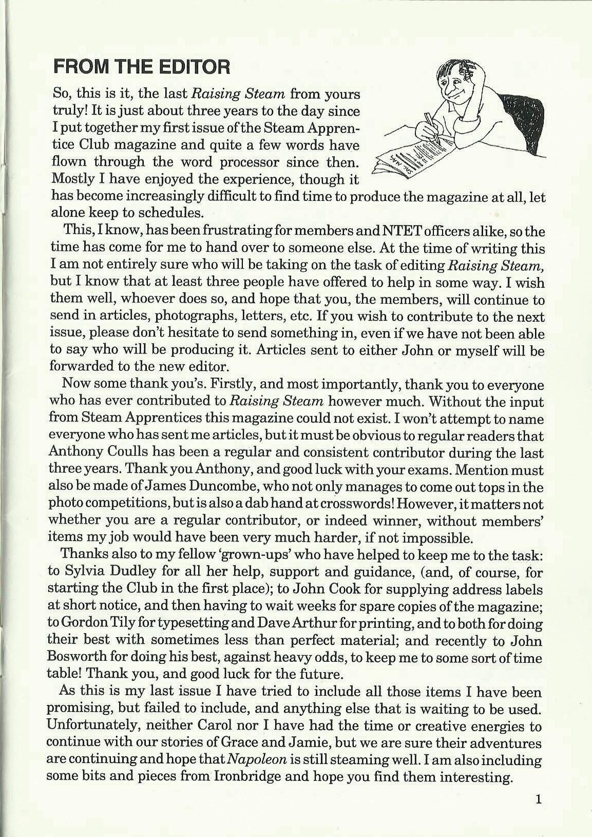 Now some thank you's. Firstly, and most importantly, thank you to everyone who has ever contributed to Raising Steam however much. Without the input from Steam Apprentices this magazine could not exist. I won't attempt to name everyone who has sent me articles, but it must be obvious to regular readers that Anthony Coulls has been a regular and consistent contributor during the last three years. Thank you Anthony, and good luck with your exams. Mention must also be made of James Duncombe, who not only manages to come out tops in the photo competitions, but is also a dab hand at crosswords! However, it matters not whether you are a regular contributor, or indeed winner, without members' items my job would have been very much harder, if not impossible.