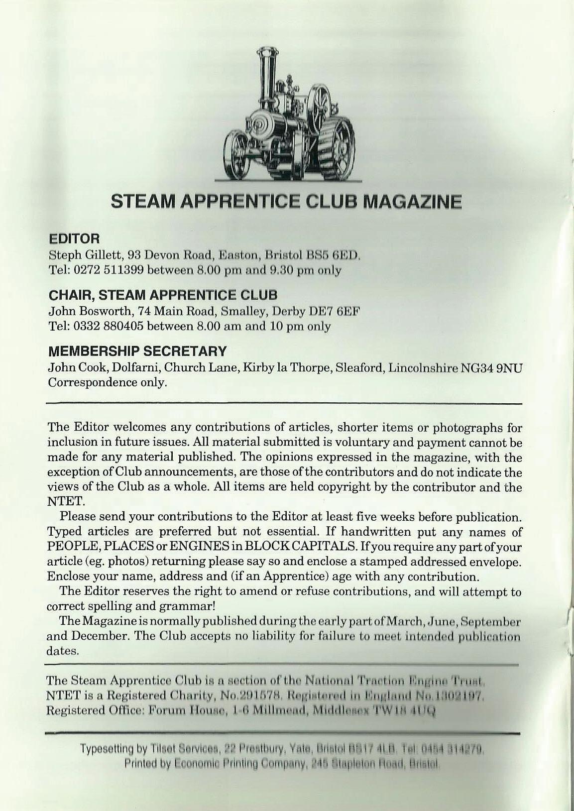 Please send your contributions to the Editor at least five weeks before publication. Typed articles are preferred but not essential. If handwritten put any names of PEOPLE, PLACES or ENGINES in BLOCK CAPITALS. If you require any part of your article (eg. photos) returning please say so and enclose a stamped addressed envelope. Enclose your name, address and (if an Apprentice) age with any contribution.
