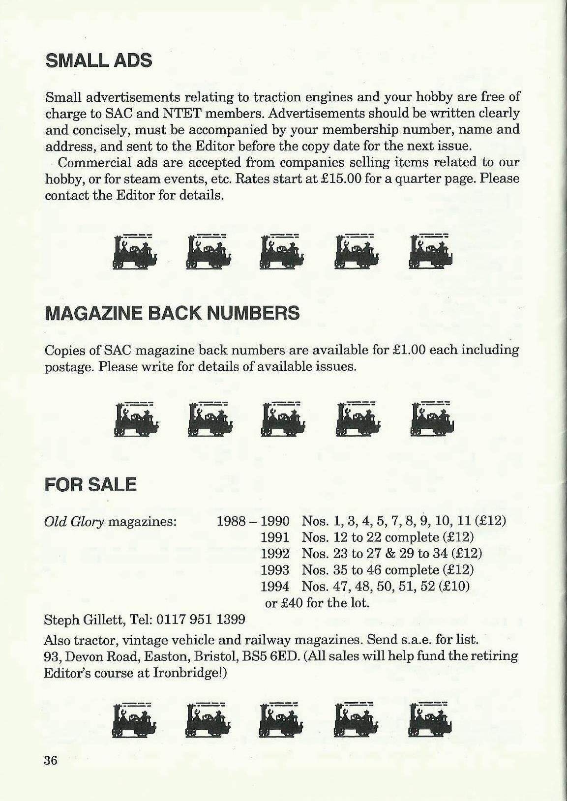 Small advertisements relating to traction engines and your hobby are free of charge to SAC and NTET members. Advertisements should be written clearly and concisely, must be accompanied by your membership number, name and address, and sent to the Editor before the copy date for the next issue. Commercial ads are accepted from companies selling items related to our hobby, or for steam events, etc. Rates start at £15.00 for a quarter page. Please contact the Editor for details.