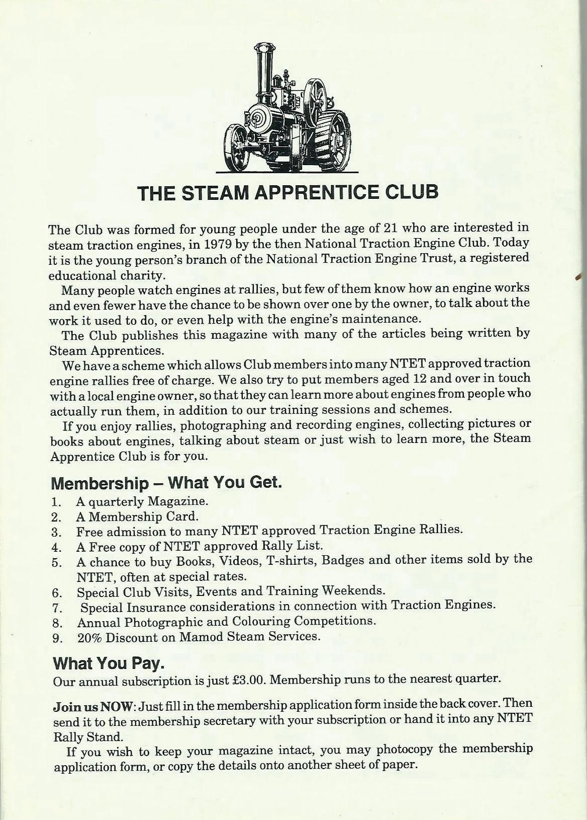 If you enjoy rallies, photographing and recording engines, collecting pictures or books about engines, talking about steam or just wish to learn more, the Steam Apprentice Club is for you.