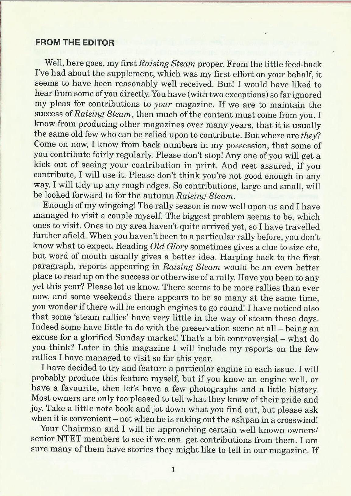 Well, here goes, my first Raising Steam proper. From the little feed-back I've had about the supplement, which was my first effort on your behalf, it seems to have been reasonably well received. But! I would have liked to hear from some of you directly. You have (with two exceptions) so far ignored my pleas for contributions to your magazine. If we are to maintain the success of Raising Steam, then much of the content must come from you. I know from producing other magazines over many years, that it is usually the same old few who can be relied upon to contribute. But where are they? Come on now, I know from back numbers in my possession, that some of you contribute fairly regularly. Please don't stop! Any one of you will get a kick out of seeing your contribution in print. And rest assured, if you contribute, I will use it. Please don't think you're not good enough in any way. I will tidy up any rough edges. So contributions, large and small, will be looked forward to for the autumn Raising Steam.