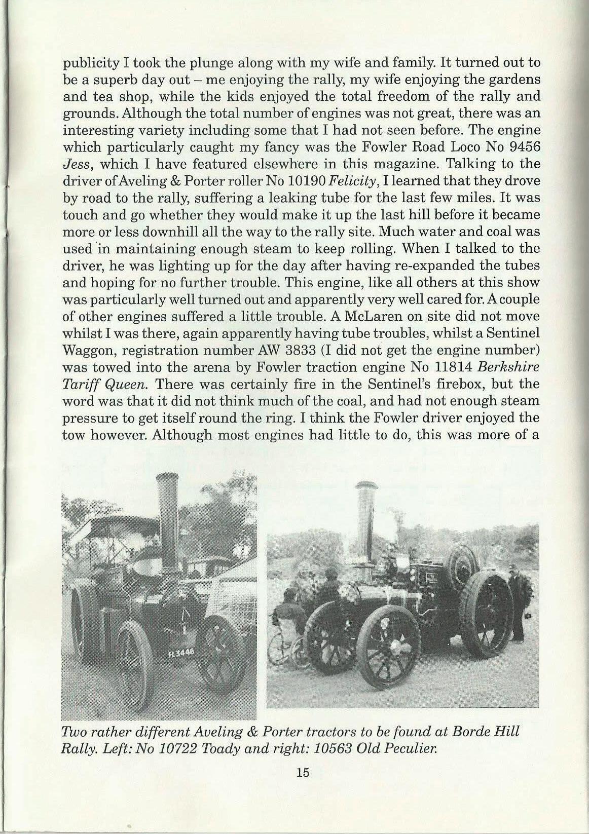publicity I took the plunge along with my wife and family. It turned out to be a superb day out - me enjoying the rally, my wife enjoying the gardens and tea shop, while the kids enjoyed the total freedom of the rally and grounds. Although the total number of engines was not great, there was an interesting variety including some that I had not seen before. The engine which particularly caught my fancy was the Fowler Road Loco No 9456 Jess, which I have featured elsewhere in this magazine. Talking to the driver ofAveling & Porter roller No 10190 Felicity, I learned that they drove by road to the rally, suffering a leaking tube for the last few miles. It was touch and go whether they would make it up the last hill before it became more or less downhill all the way to the rally site. Much water and coal was used ·in maintaining enough steam to keep rolling. When I talked to the driver, he was lighting up for the day after having re-expanded the tubes and hoping for no further trouble. This engine, like all others at this show was particularly well turned out and apparently very well cared for. A couple of other engines suffered a little trouble. A McLaren on site did not move whilst I was there, again apparently having tube troubles, whilst a Sentinel Waggon, registration number AW 3833 (I did not get the engine number) was towed into the arena by Fowler traction engine No 11814 Berkshire Tariff Queen. There was certainly fire in the Sentinel's firebox, but the word was that it did not think much of the coal, and had not enough steam pressure to get itself round the ring. I think the Fowler driver enjoyed the tow however. Although most engines had little to do, this was more of a