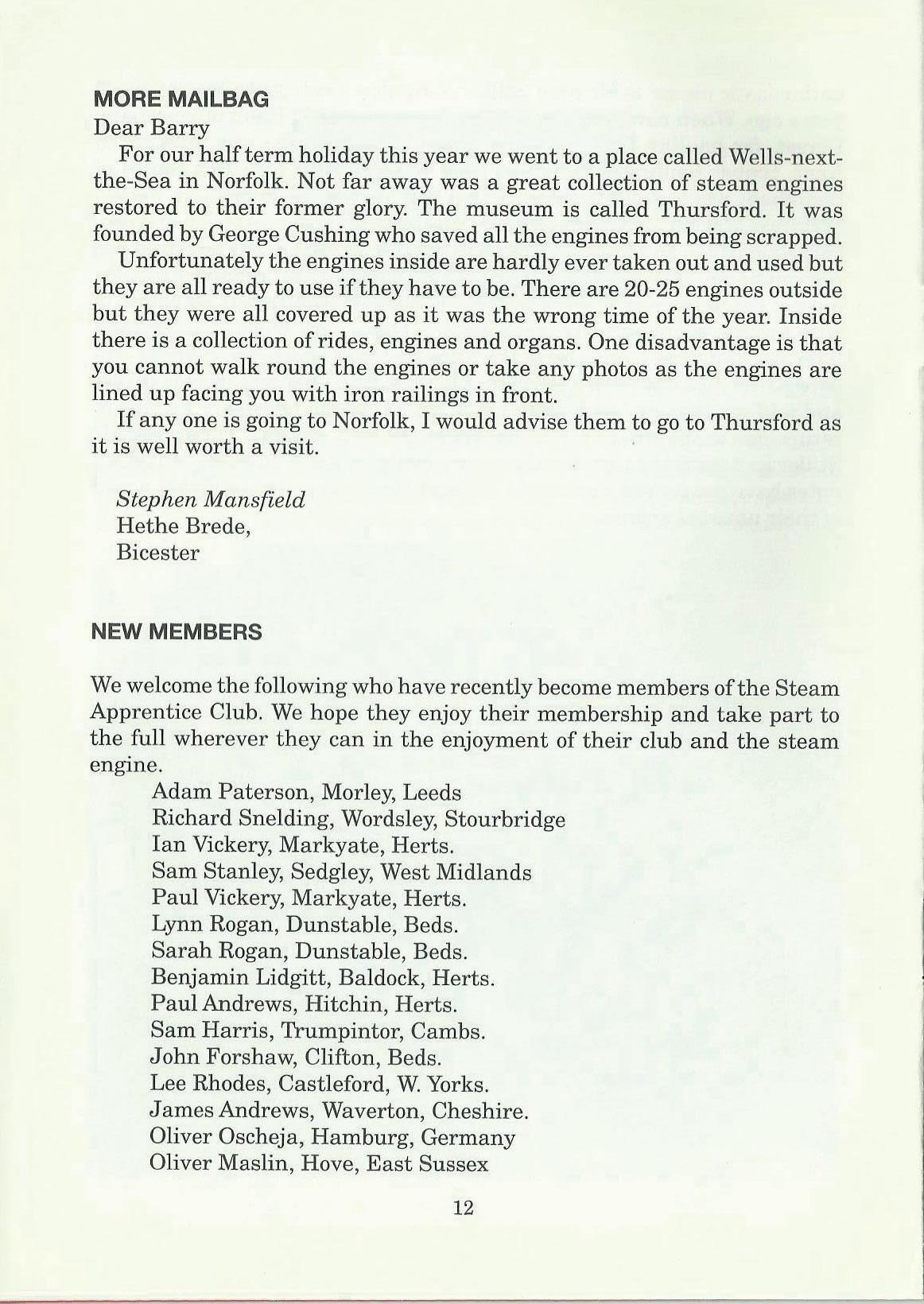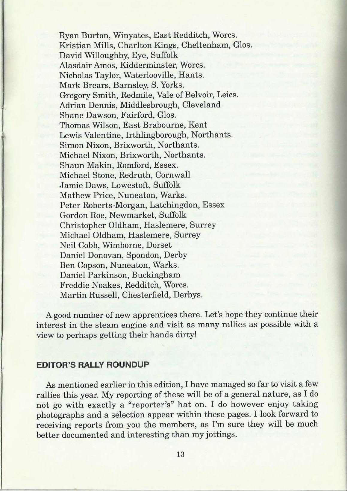 We welcome the following who have recently become members of the Steam Apprentice Club. We hope they enjoy their membership and take part to the full wherever they can in the enjoyment of their club and the steam engine.