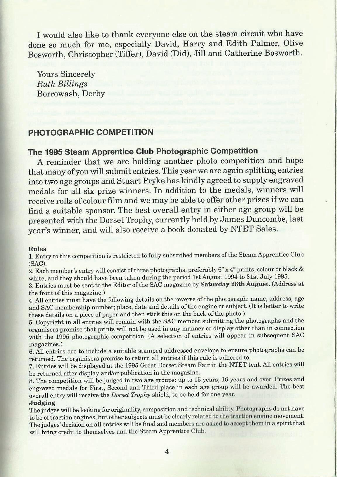We will be holding a photographic competition again this year, so get your cameras out. Entries to be in by August 26th 1995, to be judged at the Great Dorset Steam Fair.