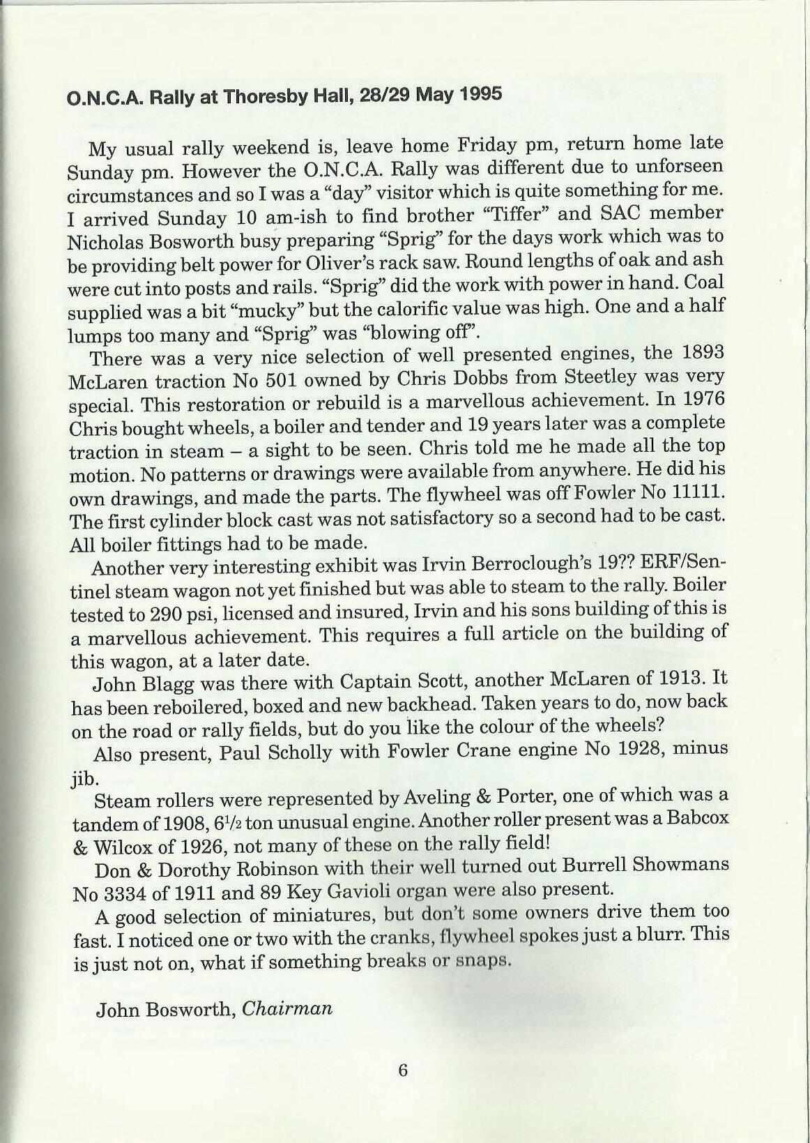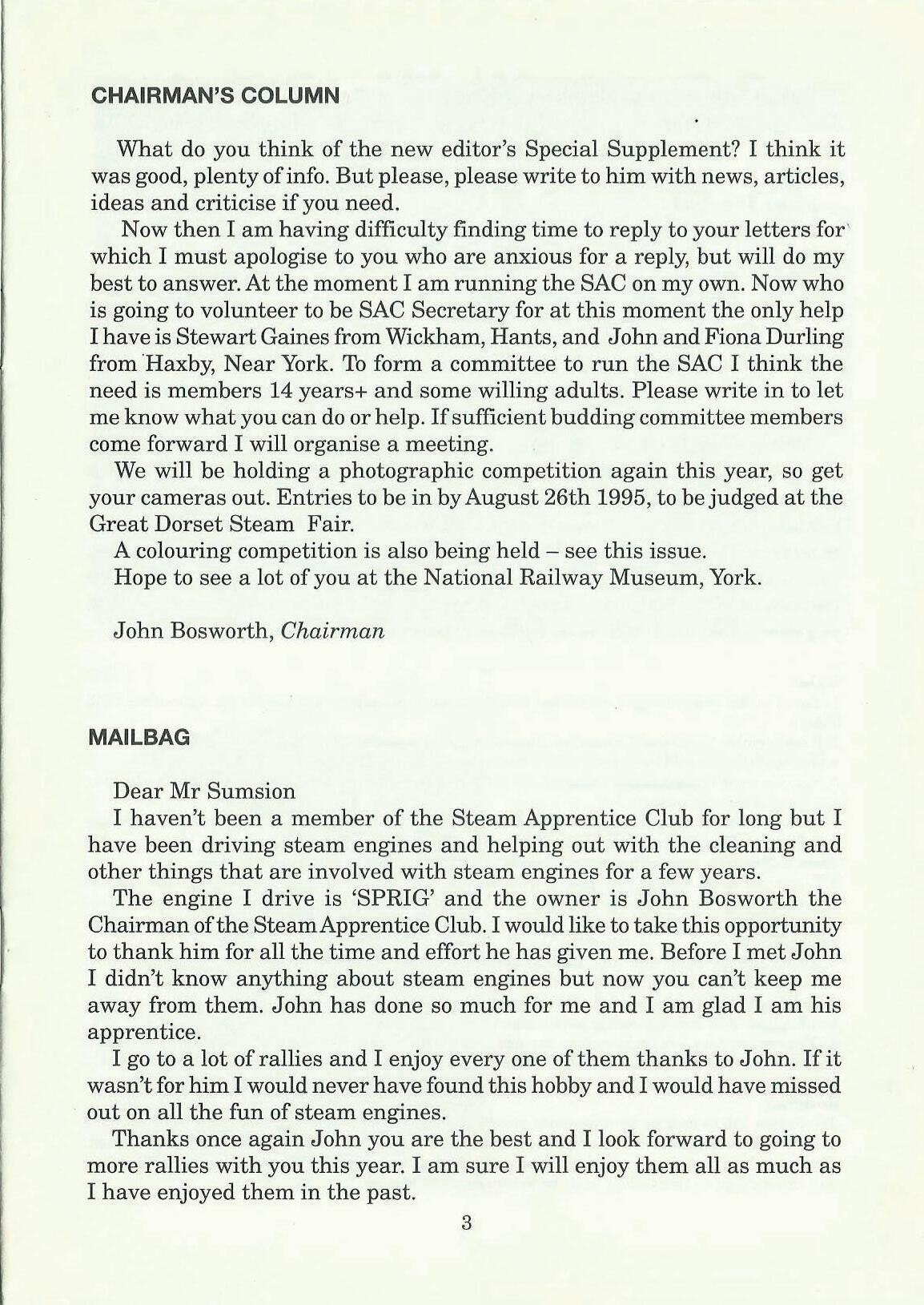 The engine I drive is 'SPRIG' and the owner is John Bosworth the Chairman of the Steam Apprentice Club. I would like to take this opportunity to thank him for all the time and effort he has given me. Before I met John I didn't know anything about steam engines but now you can't keep me away from them. John has done so much for me and I am glad I am his apprentice.