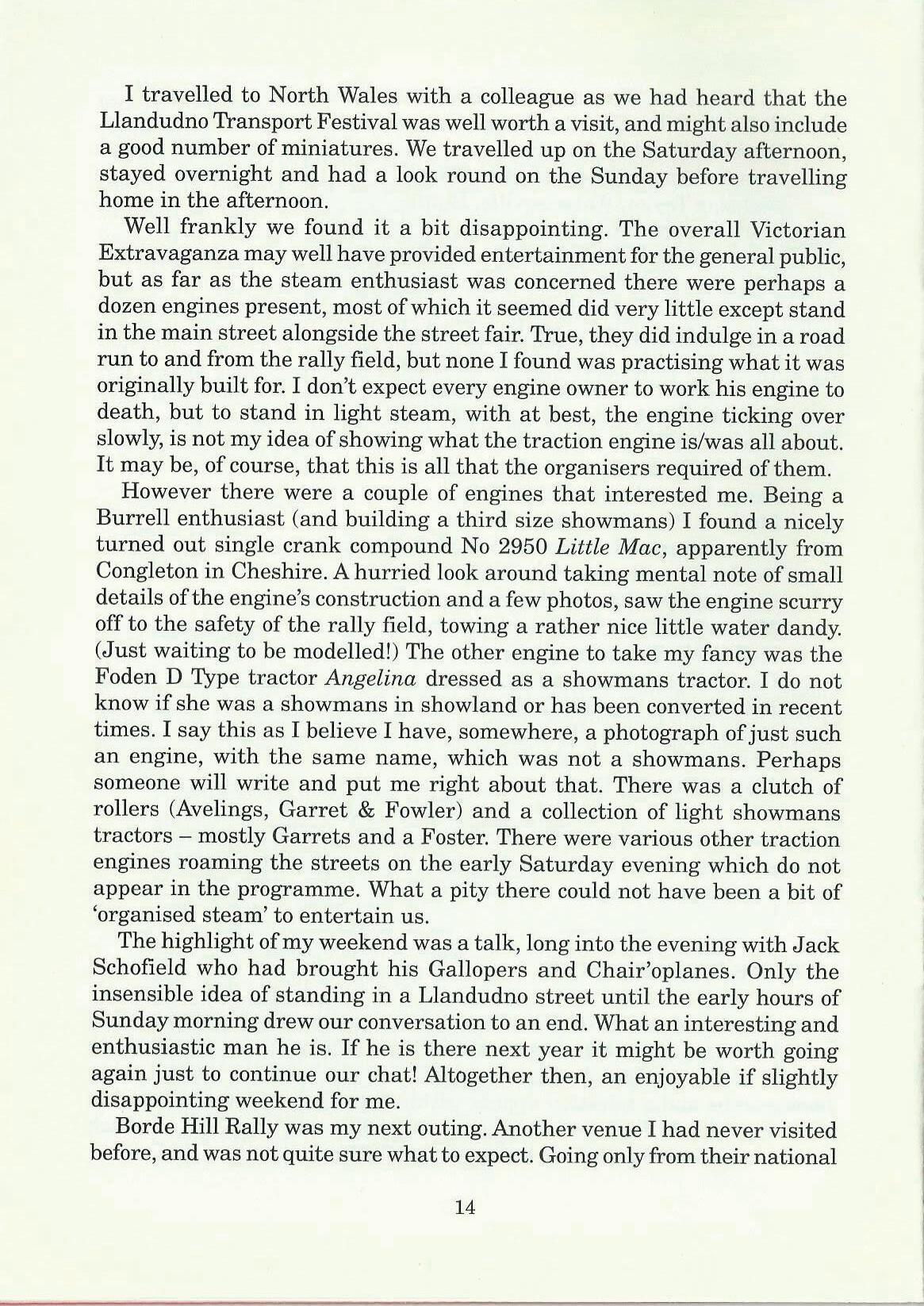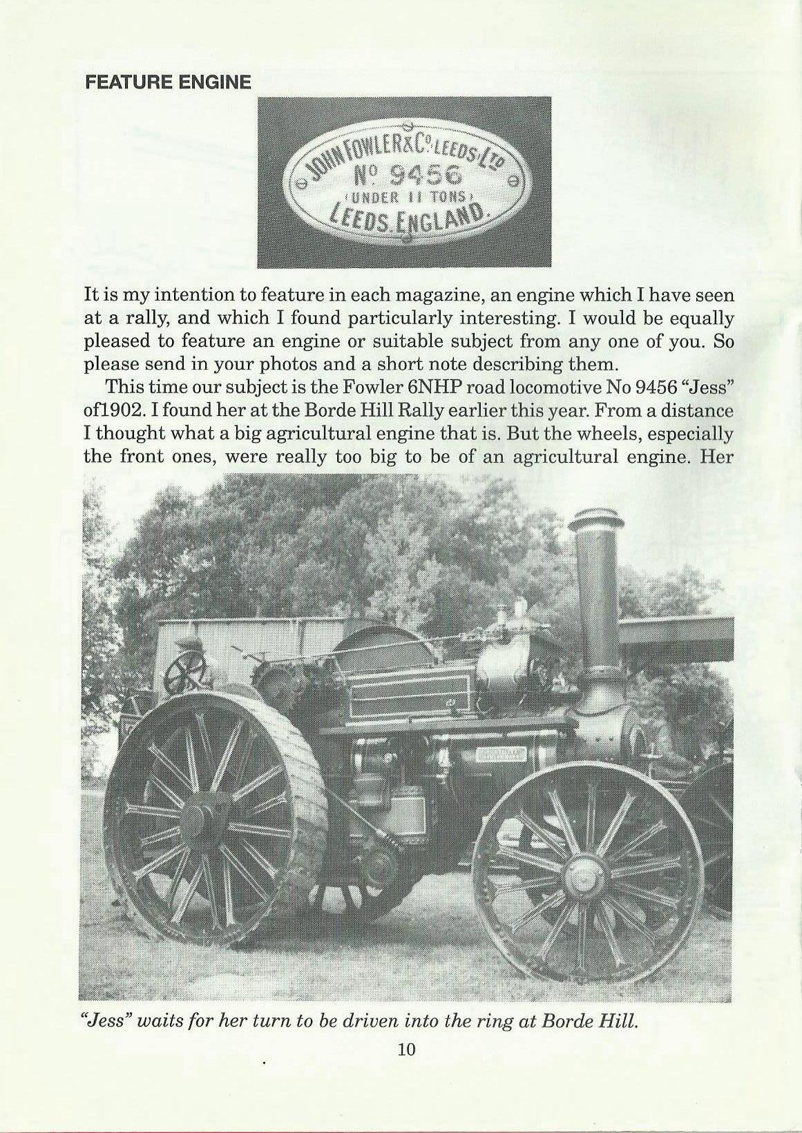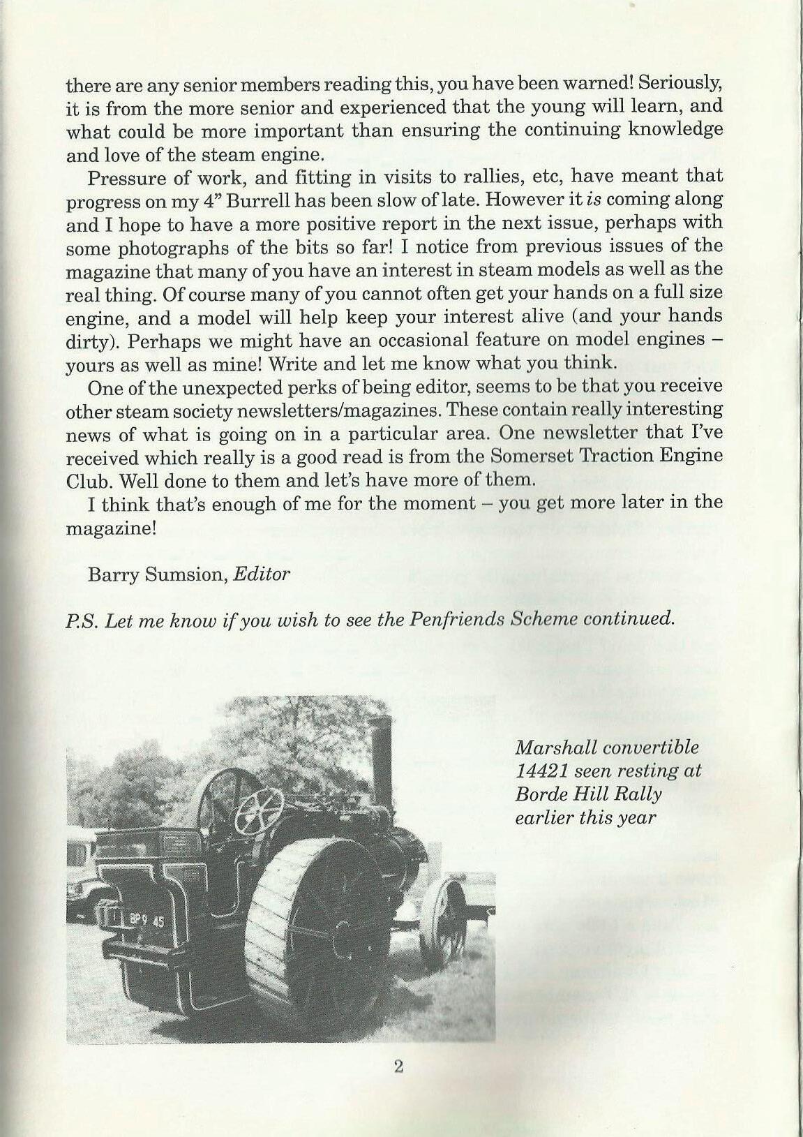 Pressure of work, and fitting in visits to rallies, etc, have meant that progress on my 4" Burrell has been slow of late. However it is coming along and I hope to have a more positive report in the next issue, perhaps with some photographs of the bits so far! I notice from previous issues of the magazine that many of you have an interest in steam models as well as the real thing. Of course many of you cannot often get your hands on a full size engine, and a model will help keep your interest alive (and your hands dirty). Perhaps we might have an occasional feature on model enginesyours as well as mine! Write and let me know what you think.