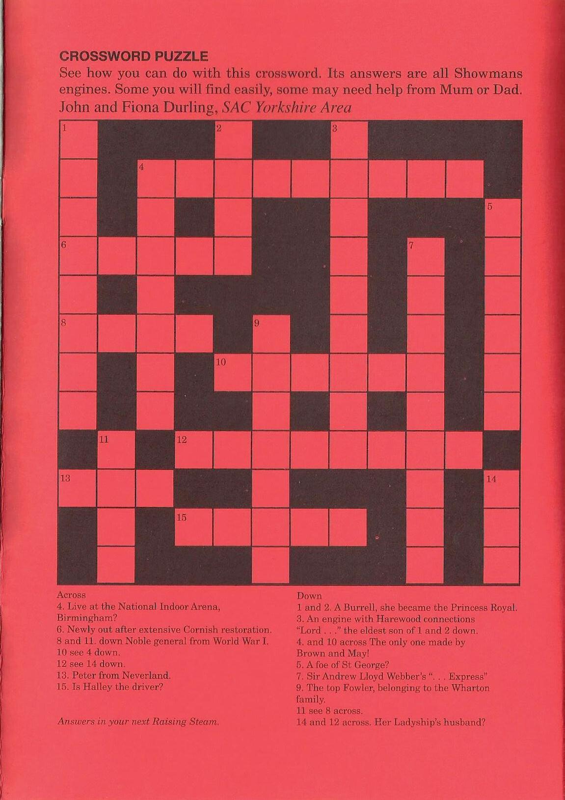 See how you can do with this crossword. Its answers are all Showmans engines. Some you will find easily, some may need help from Mum or Dad. John and Fiona Durling, SAC Yorkshire Area