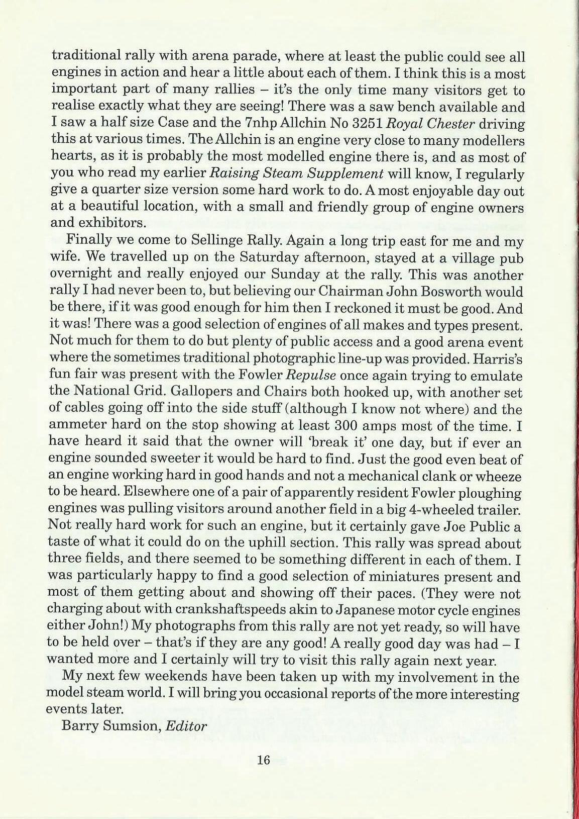 Finally we come to Sellinge Rally. Again a long trip east for me and my wife. We travelled up on the Saturday afternoon, stayed at a village pub overnight and really enjoyed our Sunday at the rally. This was another rally I had never been to, but believing our Chairman John Bosworth would be there, ifit was good enough for him then I reckoned it must be good. And it was! There was a good selection of engines of all makes and types present. Not much for them to do but plenty of public access and a good arena event where the sometimes traditional photographic line-up was provided. Harris's fun fair was present with the Fowler Repulse once again trying to emulate the National Grid. Gallopers and Chairs both hooked up, with another set of cables going off into the side stuff (although I know not where) and the ammeter hard on the stop showing at least 300 amps most of the time. I have heard it said that the owner will 'break it' one day, but if ever an engine sounded sweeter it would be hard to find. Just the good even beat of an engine working hard in good hands and not a mechanical clank or wheeze to be heard. Elsewhere one of a pair of apparently resident Fowler ploughing engines was pulling visitors around another field in a big 4-wheeled trailer. Not really hard work for such an engine, but it certainly gave Joe Public a taste of what it could do on the uphill section. This rally was spread about three fields, and there seemed to be something different in each of them. I was particularly happy to find a good selection of miniatures present and most of them getting about and showing off their paces. (They were not charging about with crankshaftspeeds akin to Japanese motor cycle engines either John!) My photographs from this rally are not yet ready, so will have to be held over -that's if they are any good! A really good day was had -I wanted more and I certainly will try to visit this rally again next year. My next few weekends have been taken up with my involvement in the model steam world. I will bring you occasional reports of the more interesting events later.