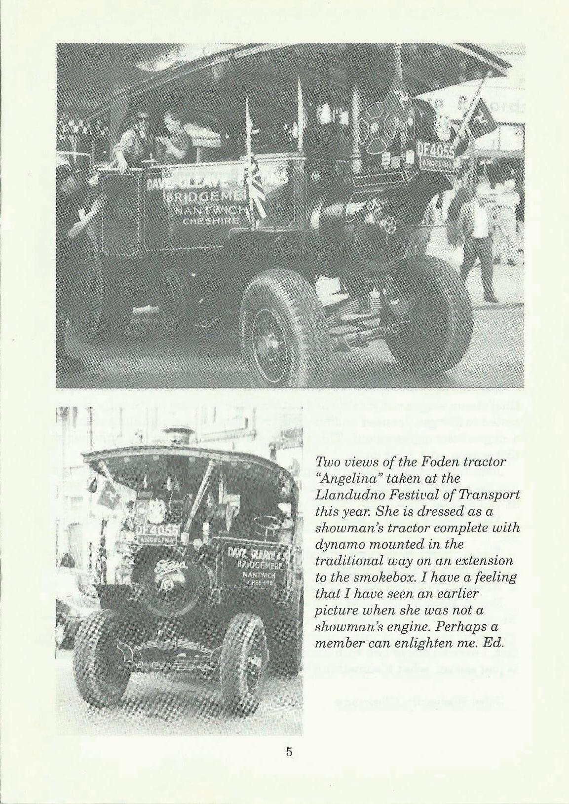 Two views of the Foden tractor "Angelina" taken at the Llandudno Festival of Transport this year. She is dressed as a showman's tractor complete with dynamo mounted in the traditional way on an extension to the smokebox. I have a feeling that I have seen an earlier picture when she was not a showman's engine. Perhaps a member can enlighten me. Ed.